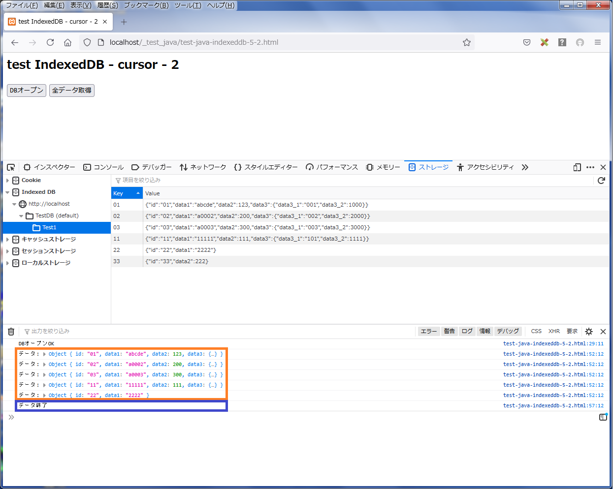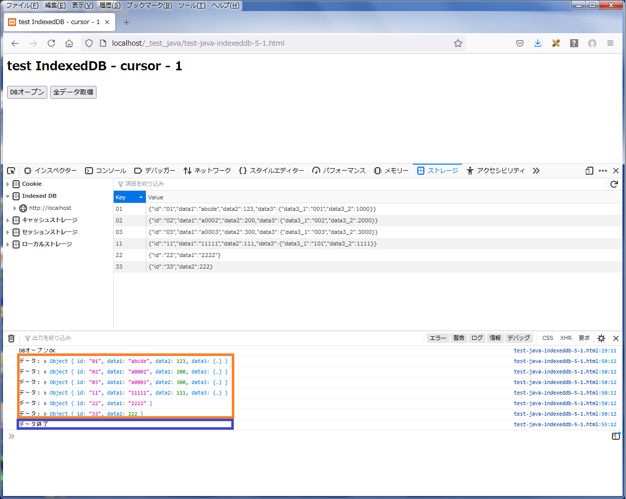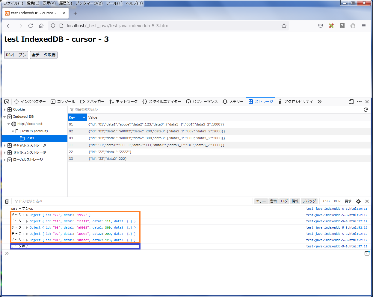 「DBオープン」ボタンをクリック後 「全データ取得」ボタンをクリックすると、 ブラウザの「ウエブ開発ツール」のコンソールににキーの昇順で順次データレコードの内容が表示され、最後に「データ終了」が表示されるのが分かります(下図参照)。