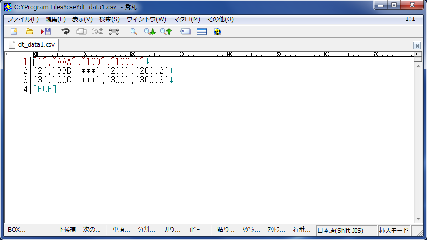 そこで、新しいCSVファイルをテキストエディタで作成してみます。 「dt_data1-inp1.csv」として以下の図の様に3件のデータを作成します。
