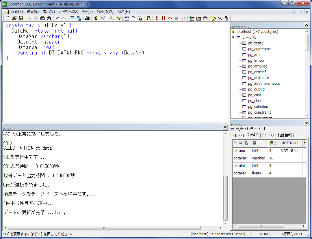 再度「DBエクスプローラ」のテーブル「dt_data1」上で「全データを開く」を選択すれば、 入力されたデータがコンソールの部分に表示されるはずです。