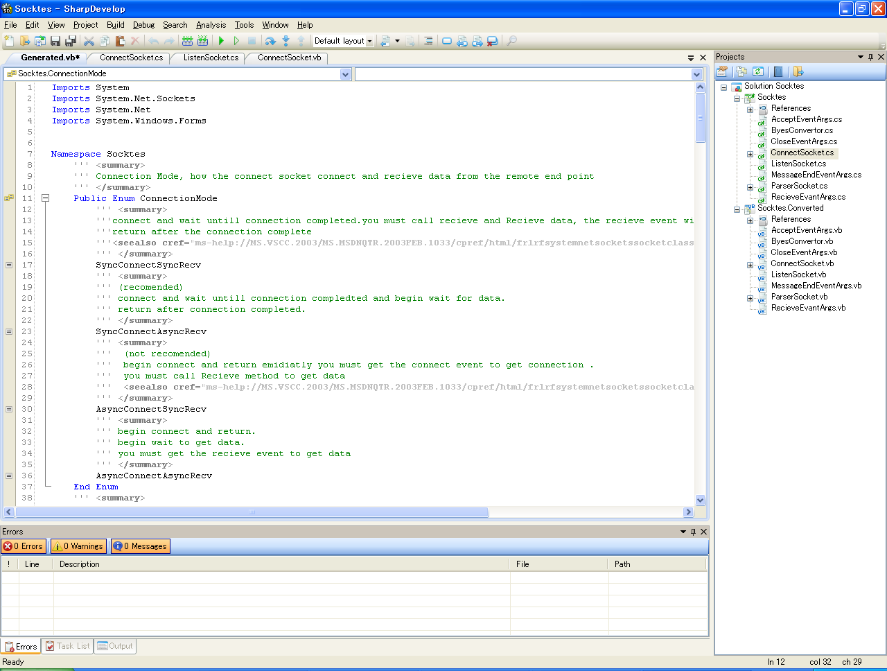 C#のソリューション名が「Socktes」なのでVB.NETの方は「Socktes.Converted」となり、ソースは全て「cs」から「vb」に変わったことが分かります。