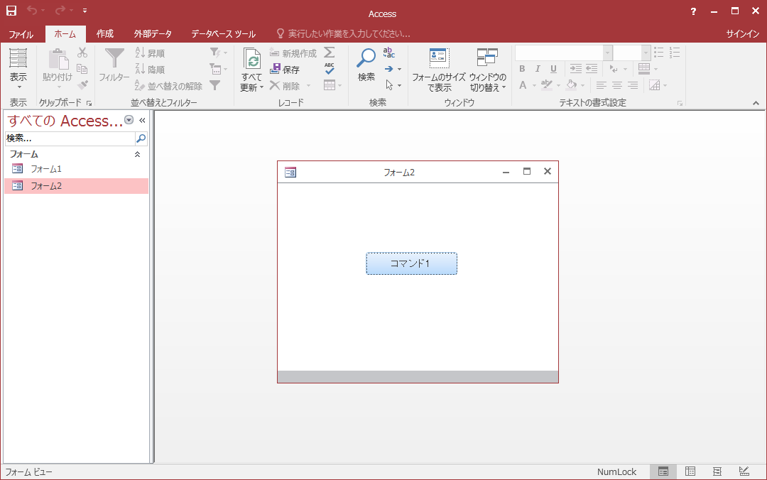 Option Compare Database ' クラスWordオブジェクト Private mclsWord As clsWord '------------------------------------------------------------------------------ ' フォームロード時イベント '------------------------------------------------------------------------------ Private Sub Form_Load() Set mclsWord = New clsWord End Sub '------------------------------------------------------------------------------ ' フォームクローズイベント '------------------------------------------------------------------------------ Private Sub Form_Close() 'ワードクローズ mclsWord.WordClose 'Wordオブジェクト解放 Set mclsWord = Nothing End Sub '------------------------------------------------------------------------------ ' コマンド1開始 '------------------------------------------------------------------------------ Private Sub コマンド1_Click() Dim strPath As String 'ワードファイルを読み込み、文章を編集する状態にする strPath = Application.CurrentProject.path & "\" & "sample.docx" 'ワードファイルを読込み編集状態で表示する mclsWord.WordOpen strPath, True End Sub上記のソースでの注意点は、クラスWordオブジェクトの変数をフォームの静的変数として宣言しているところです。