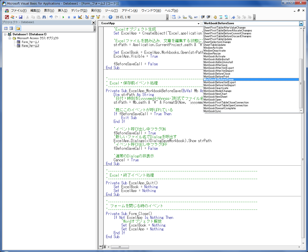 なぜならば、コマンドボタンでワードを起動した後で、本クラス内での保存前イベント処理(DocumentBeforeSave)が起こらなくなるからです。 後は、フォームのクローズ時には後片付けも必要になります。