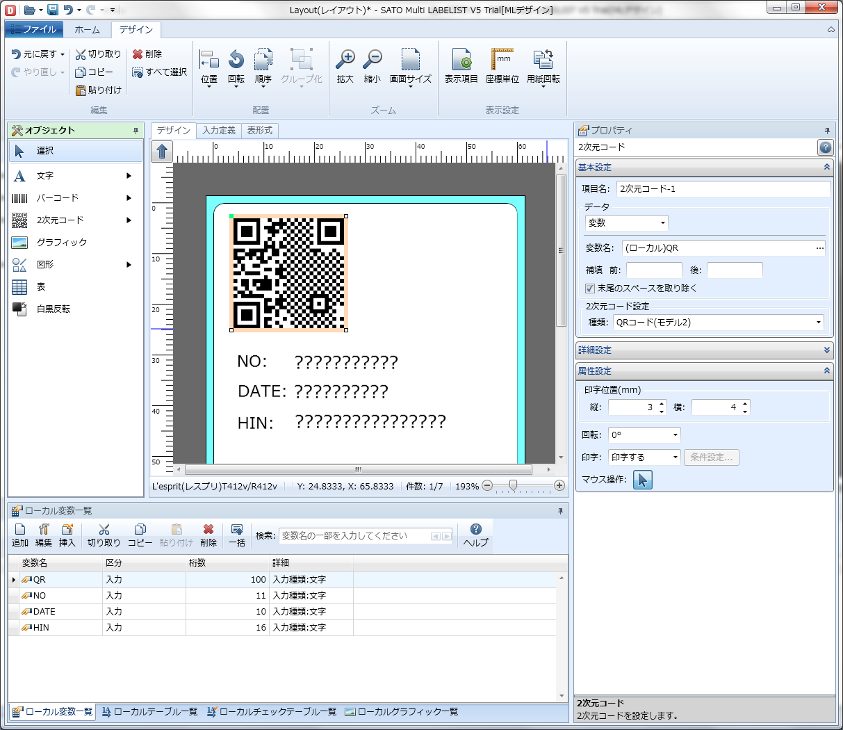 今回使用するレイアウトファイルの編集中の画面を以下に示します。 連番(NO)、日付、品番、QRコードのみを印刷する簡単なレイアウトで、デザインを作成したところです。