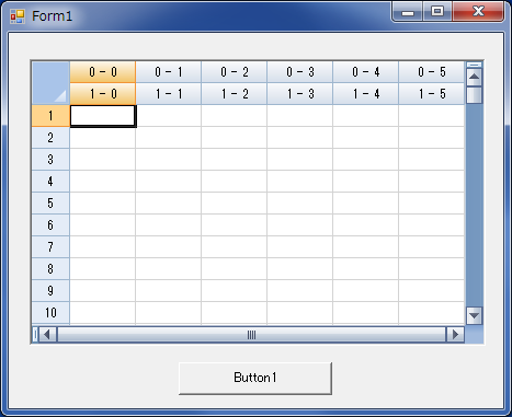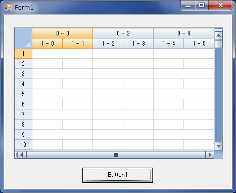 'ボタンクリックでカラム連結処理 Private Sub Button1_Click(ByVal sender As System.Object, ByVal e As System.EventArgs) Handles Button1.Click '行ヘッダーのカラムを2個ずつ連結する For i As Integer = 0 To Me.FpSpread1.ActiveSheet.ColumnCount / 2 - 1 Me.FpSpread1.ActiveSheet.AddColumnHeaderSpanCell(0, i * 2, 1, 2) Next 'シート上のカラムを1行おきに、2個ずつ連結する For row As Integer = 0 To Me.FpSpread1.ActiveSheet.RowCount - 1 '行番号が偶数?? If row Mod 2 = 0 Then 'カラムを2個ずつ連結する For i As Integer = 0 To Me.FpSpread1.ActiveSheet.ColumnCount / 2 - 1 Me.FpSpread1.ActiveSheet.AddSpanCell(row, i * 2, 1, 2) Next End If Next End Sub