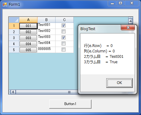 1行目の「001」ボタンをクリックした結果が以下の図です。 (メッセージBOXの表示をForm1の上に移動して画面キャプチャしていますので実際の表示位置とは異なります)