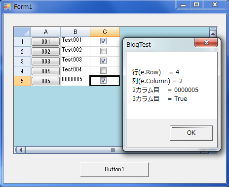 「ButtonClicked」イベントの引数である「e」のプロパティ「Row」「Column」で クリック時の行、カラム位置が分かります。このプロパティを使ってセルの情報を取得します。