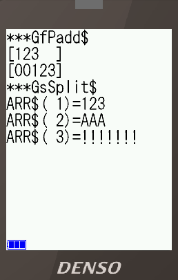 '----- '実行はここから処理 '----- Main SCREEN 1 '漢字モード LOCATE , , 2 'カーソルをブロック表示 PRINT "***GfPadd$" PRIVATE W$, W2$ W$ = GfPadd$(GcTrue%, "123", 5, " ") PRINT "[" + W$ + "]" W$ = GfPadd$(GcFalse%, "123", 5, "0") PRINT "[" + W$ + "]" PRINT "***GsSplit$" PRIVATE ARR$(10) CALL GsSplit$("123,AAA,!!!!!!!", ",", ARR$) FOR I% = 1 TO 3 PRINT "ARR$("; I%; PRINT ")="; ARR$(I%) NEXT WAIT 0, &h01 'キー入力待ち ENDこれを実行すると以下の様な表示になります。