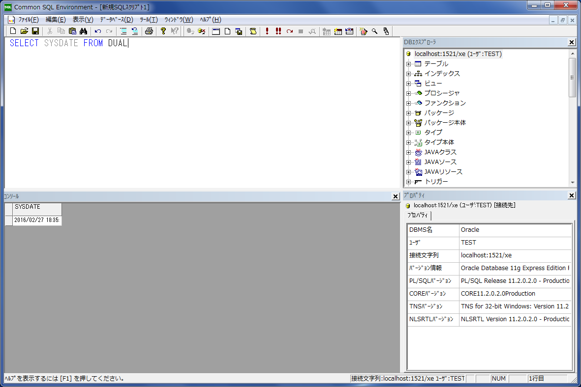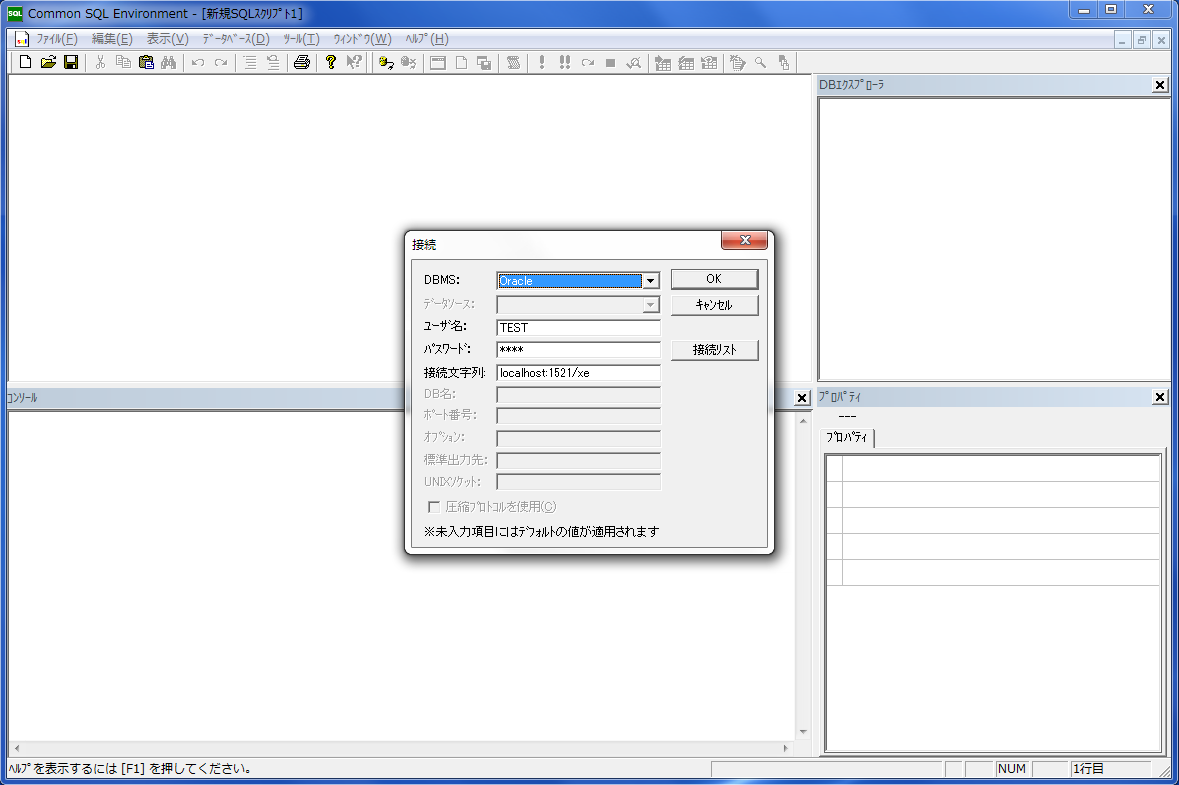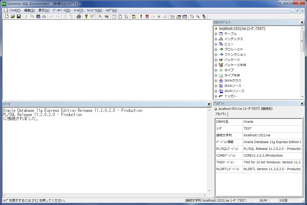 では実際にオラクルへの接続を行います。 下図はCSEからの接続時の様子です。 テストユーザとして「TEST」での接続を行います。 尚、このユーザは既にパスワードを「TEST」とし、「DBA」権限を与えてあります。 接続文字列として「localhost:1251/xe」を指定します。