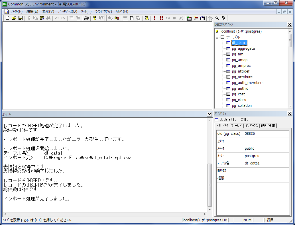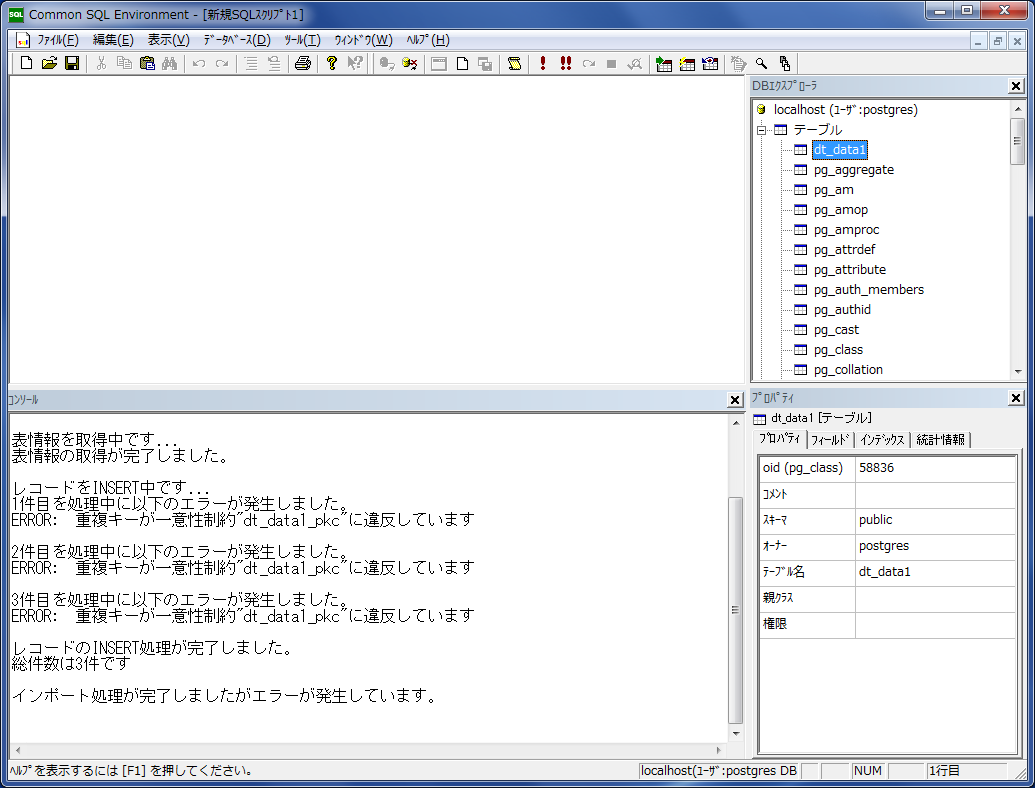 インポート処理のメッセージがコンソールに表示されます。 「dt_data1.csv」のデータはテーブルの中に既に存在しますので、3行のエラーが表示されます。 当然インポート処理は失敗となります。