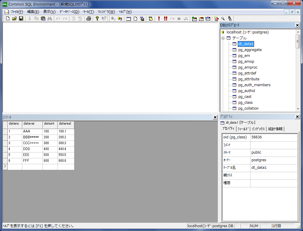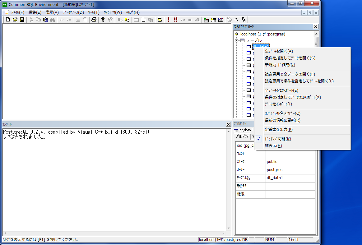 まず最初に、前回のCSVデータ出力で出力された「dt_data1.csv」ファイルをCSEで入力してみます。 「DBエクスプローラ」に表示されているテーブル「dt_data1」の上で右クリックします。 メニューの中から、真ん中下あたりの「データをインポート」を選びます。