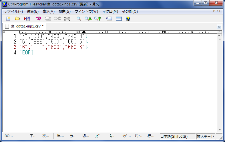 そこで、新しいCSVファイルをテキストエディタで作成してみます。 「dt_data1-inp1.csv」として以下の図の様に3件のデータを作成します。