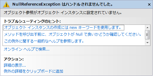 変数 str を初期化せずにString型のLengthプロパティを使うとエラーが発生します。 「NullReferenceException」エラーが発生します。(NULLであるオブジェクトを参照したというエラー)