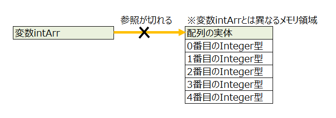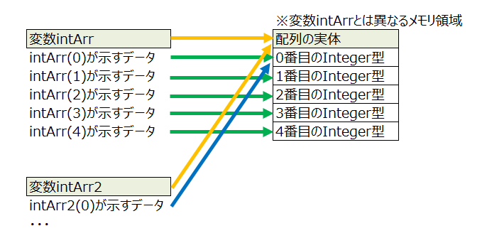 このソースで表示される結果からわかるように、 「intArr2」と「intArr」が示すデータは全く同じものになります。 「intArr2」に「intArr」をコピーしているので当然なのですが、 「intArr」の配列の実体は5個のInteger型のデータの並びなのですが、 それを参照しているものが「intArr」の変数の中身なのです。 図で示すと以下の様な感じです。