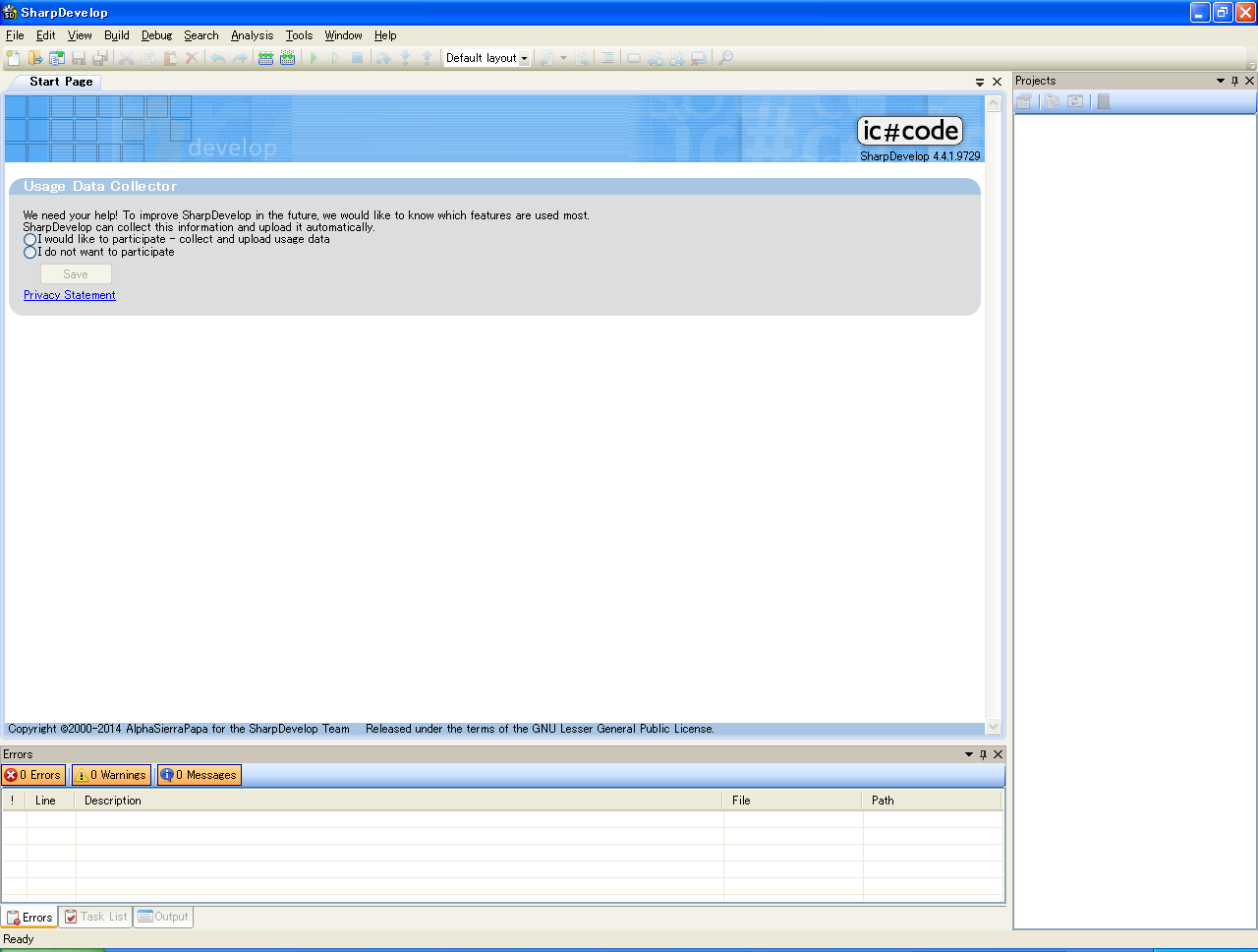 以下はSharpDevelopを最初に起動した画面です。