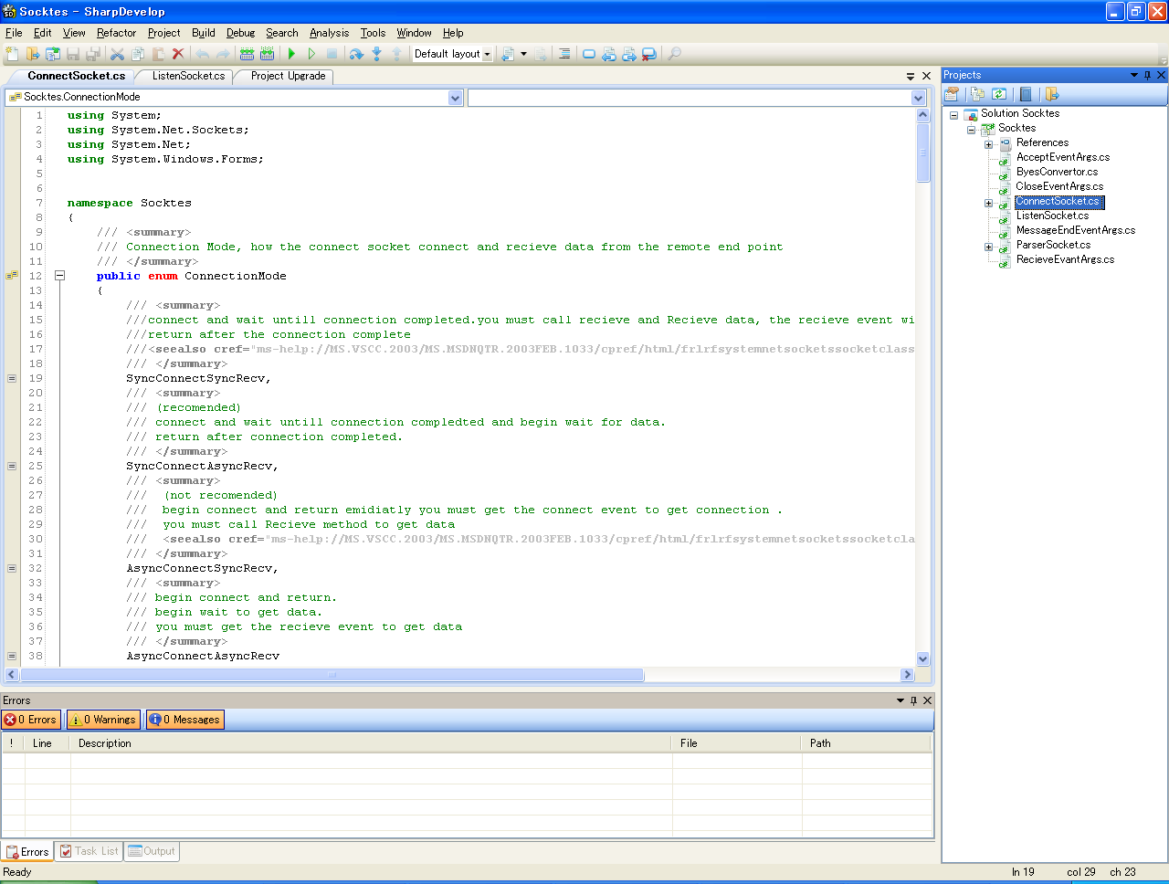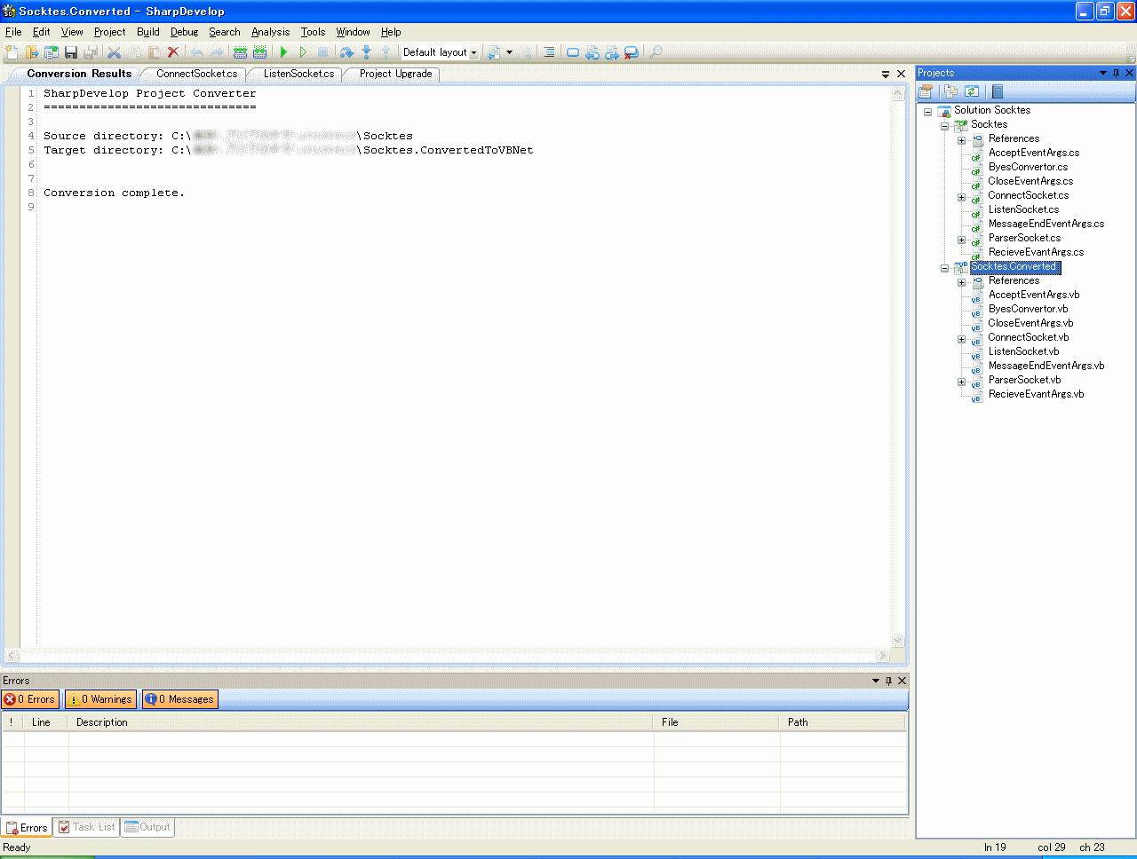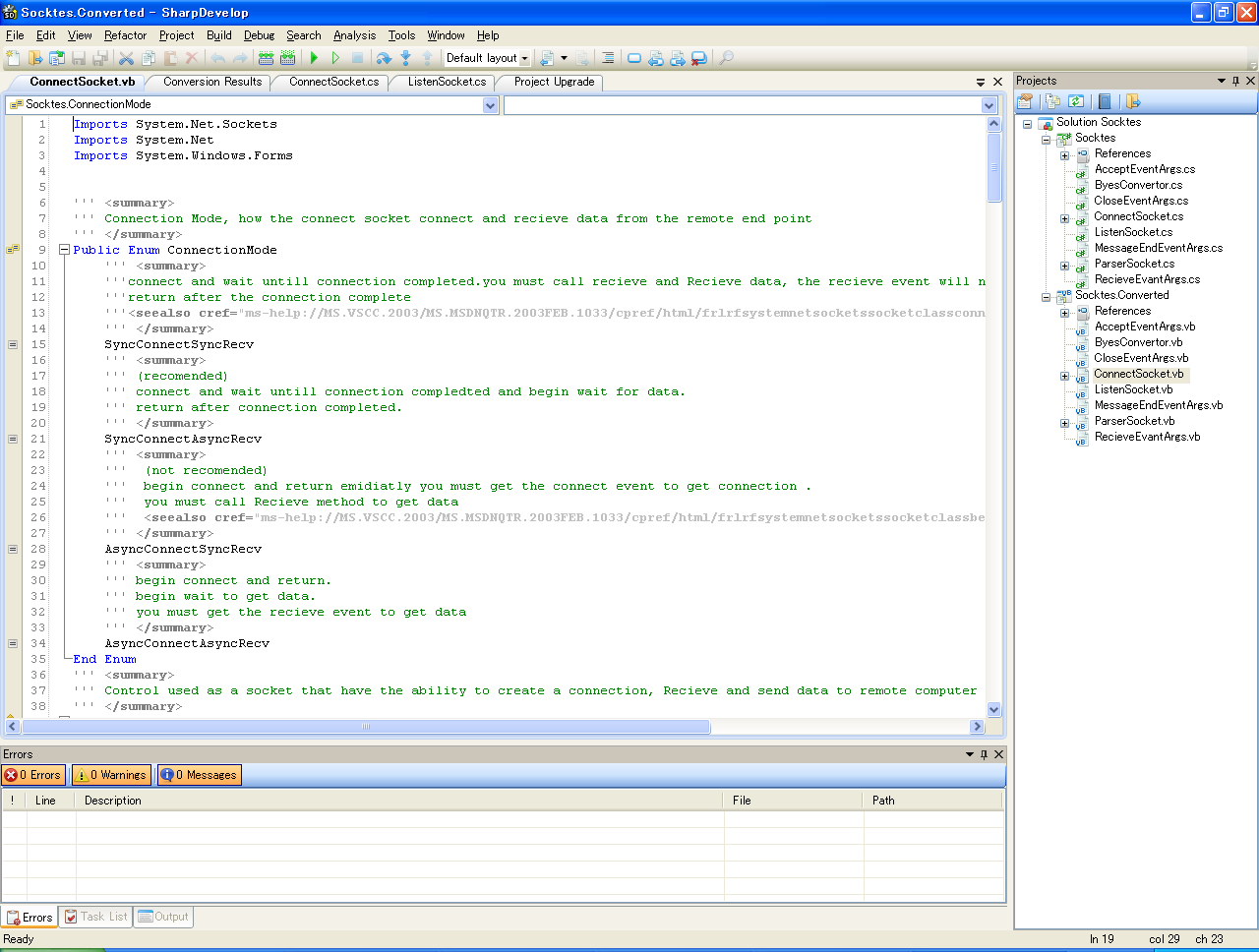 C#のソリューション名が「Socktes」なのでVB.NETの方は「Socktes.Converted」となり、ソースは全て「cs」から「vb」に変わったことが分かります。