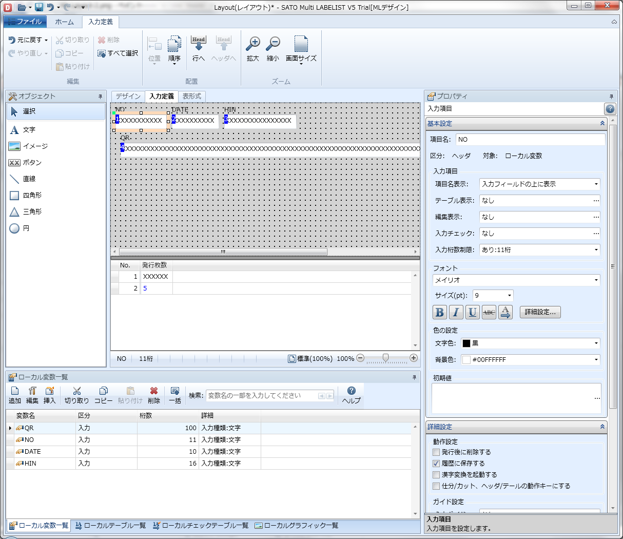 今回使用するレイアウトファイルの編集中の画面を以下に示します。 連番(NO)、日付、品番、QRコードのみを印刷する簡単なレイアウトで、デザインを作成したところです。