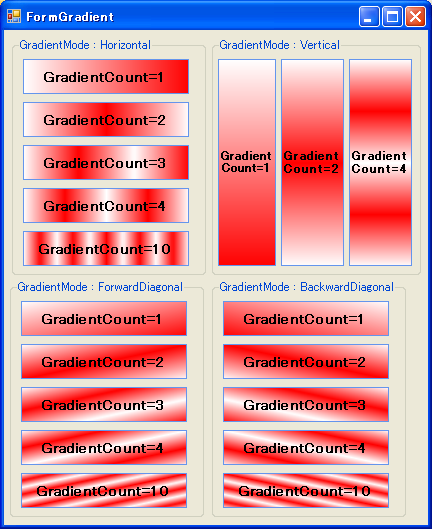 (デフォルトのBackColorからBackColor2への色の変化)FrameColorラベルの枠色 GradientModeグラデーションの方向(LinearGradientMode) GradientCountグラデーションの回数