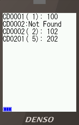 SCREEN 1 '漢字モード LOCATE , , 2 'カーソルをブロック表示 '最初は書き込み処理の連続 PRIVATE W% W% = MfPutData2%("CD0001", 100, GcTrue%, 0) W% = MfPutData2%("CD0002", 102, GcFalse%, 0) W% = MfPutData2%("CD0003", 1030, GcTrue%, 0) W% = MfPutData2%("CD0101", 201, GcTrue%, 0) W% = MfPutData2%("CD0201", 202, GcFalse%, 0) W% = MfPutData2%("CD1001", 500, GcTrue%, 0) PRIVATE CD$, RNO&, NUM& CD$ = "CD0001" '削除ONで検索⇒検索OK W% = MfSearchData2%(CD$, GcTrue%, NUM&, RNO&) IF W% = GcTrue% THEN PRINT CD$ + "(" + STR$(RNO&) + "):" + STR$(NUM&) ELSE PRINT CD$ + ":Not Found" ENDIF CD$ = "CD0002" '削除ONで検索⇒検索NG W% = MfSearchData2%(CD$, GcTrue%, NUM&, RNO&) IF W% = GcTrue% THEN PRINT CD$ + "(" + STR$(RNO&) + "):" + STR$(NUM&) ELSE PRINT CD$ + ":Not Found" ENDIF CD$ = "CD0002" '削除OFFで検索⇒検索OK W% = MfSearchData2%(CD$, GcFalse%, NUM&, RNO&) IF W% = GcTrue% THEN PRINT CD$ + "(" + STR$(RNO&) + "):" + STR$(NUM&) ELSE PRINT CD$ + ":Not Found" ENDIF CD$ = "CD0201" '削除OFFで検索⇒検索OK W% = MfSearchData2%(CD$, GcFalse%, NUM&, RNO&) IF W% = GcTrue% THEN PRINT CD$ + "(" + STR$(RNO&) + "):" + STR$(NUM&) ELSE PRINT CD$ + ":Not Found" ENDIF WAIT 0, &h01 'キー入力待ち END