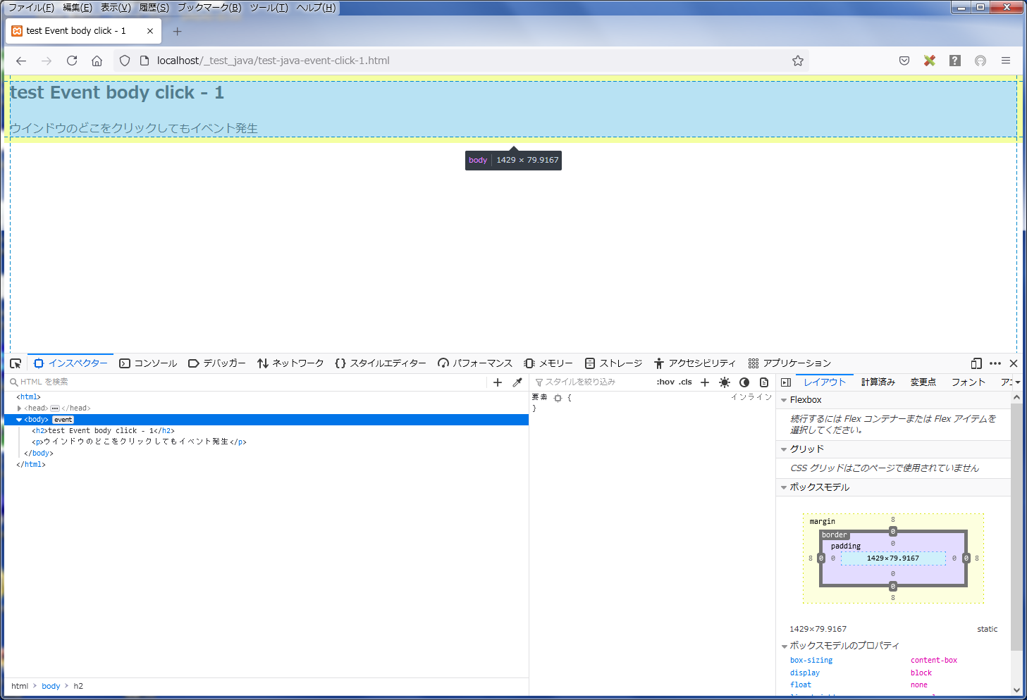 <html> <head> <meta charset="utf-8"> <title>test Event body click - 1</title> <script src="https://code.jquery.com/jquery-3.4.1.min.js"></script> <script type="text/javascript"> $(function () { //ウインドウ内クリックでの処理 document.body.onclick = function ( event ) { alert("document.body.onclick...event"); } }); </script> </head> <body> <h2>test Event body click - 1</h2> <p>ウインドウのどこをクリックしてもイベント発生</p> </body> </html>これを実行しますと確かにクリックするとアラートが表示されるのですが、場所が限定されています。