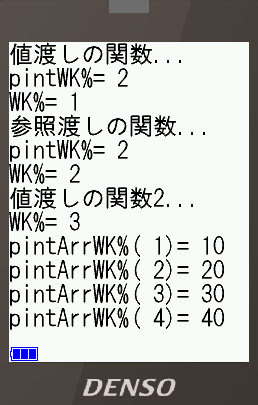また、配列データを引数で渡す時には値渡しではできなく、 参照渡しにしなければなりません。 配列データは多くのメモリ領域を必要とするため、 BHT-BASICではメモリもそんなに多くないので、 参照渡しの仕様にしたのだと思います。