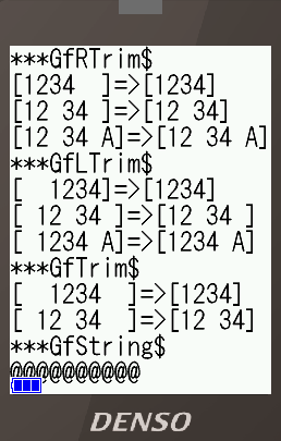 これらの関数の実行ソースは以下の様になります。Sub DispData(Byval strP1$, Byval strP2$) PRINT "[" + strP1$ + "]=>[" + strP2$ + "]" End Sub '----- '実行はここから処理 '----- Main ' PRIVATE Num$, nRet%, intLoop% SCREEN 1 '漢字モード LOCATE , , 2 'カーソルをブロック表示 PRINT "***GfRTrim$" PRIVATE W$, W2$ W$ = "1234 " W2$ = GfRTrim$(W$) CALL DispData(W$, W2$) W$ = "12 34 " W2$ = GfRTrim$(W$) CALL DispData(W$, W2$) W$ = "12 34 A" W2$ = GfRTrim$(W$) CALL DispData(W$, W2$) PRINT "***GfLTrim$" W$ = " 1234" W2$ = GfLTrim$(W$) CALL DispData(W$, W2$) W$ = " 12 34 " W2$ = GfLTrim$(W$) CALL DispData(W$, W2$) W$ = " 1234 A" W2$ = GfLTrim$(W$) CALL DispData(W$, W2$) PRINT "***GfTrim$" W$ = " 1234 " W2$ = GfTrim$(W$) CALL DispData(W$, W2$) W$ = " 12 34 " W2$ = GfTrim$(W$) CALL DispData(W$, W2$) PRINT "***GfString$" W$ = GfString$("@", 10) PRINT W$; WAIT 0, &h01 'キー入力待ち ENDこれを実行すると以下の様な表示になります。