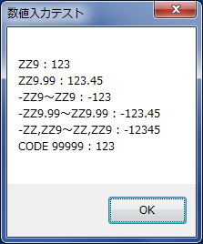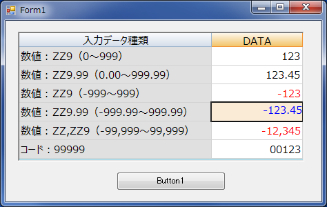 Imports FarPoint.Win.Spread.CellType Public Class Form1 'フォームロード時イベントで各数値セルの初期化 Private Sub Form1_Load(sender As Object, e As EventArgs) Handles MyBase.Load Dim NumCell As New NumberCellType '【ZZ9】 With NumCell .DecimalPlaces = 0 .MaximumValue = 999 .MinimumValue = 0 End With FpSpread1.ActiveSheet.Cells(0, 1).CellType = NumCell '【ZZ9.99】 NumCell = New NumberCellType With NumCell .DecimalPlaces = 2 .MaximumValue = 999.99 .MinimumValue = 0 End With FpSpread1.ActiveSheet.Cells(1, 1).CellType = NumCell '【-ZZ9~ZZ9】 NumCell = New NumberCellType With NumCell .DecimalPlaces = 0 .MaximumValue = 999 .MinimumValue = -999 .NegativeRed = True End With FpSpread1.ActiveSheet.Cells(2, 1).CellType = NumCell '【-ZZ9.99~ZZ9.99】 NumCell = New NumberCellType With NumCell .DecimalPlaces = 2 .MaximumValue = 999.99 .MinimumValue = -999.99 .NegativeRed = True End With FpSpread1.ActiveSheet.Cells(3, 1).CellType = NumCell '【-ZZ,ZZ9~ZZ,ZZ9】 NumCell = New NumberCellType With NumCell .DecimalPlaces = 0 .MaximumValue = 99999 .MinimumValue = -99999 .NegativeRed = True .Separator = "," .ShowSeparator = True End With FpSpread1.ActiveSheet.Cells(4, 1).CellType = NumCell '【CODE 99999】 Dim CdCell = New CodeCellType With CdCell .MaximumValue = 99999 .MinimumValue = 0 End With FpSpread1.ActiveSheet.Cells(5, 1).CellType = CdCell End Sub '編集中に背景色と文字色を変える Private Sub FpSpread1_EditModeOn(sender As Object, e As EventArgs) Handles FpSpread1.EditModeOn CType(FpSpread1.EditingControl, GeneralEditor).BackColor = Color.AntiqueWhite CType(FpSpread1.EditingControl, GeneralEditor).ForeColor = Color.Blue End Sub '入力データの取得・表示 Private Sub Button1_Click(sender As Object, e As EventArgs) Handles Button1.Click Dim str As String = "" str &= "ZZ9 : " & Me.FpSpread1.ActiveSheet.GetValue(0, 1) & vbCrLf str &= "ZZ9.99 : " & Me.FpSpread1.ActiveSheet.GetValue(1, 1) & vbCrLf str &= "-ZZ9~ZZ9 : " & Me.FpSpread1.ActiveSheet.GetValue(2, 1) & vbCrLf str &= "-ZZ9.99~ZZ9.99 : " & Me.FpSpread1.ActiveSheet.GetValue(3, 1) & vbCrLf str &= "-ZZ,ZZ9~ZZ,ZZ9 : " & Me.FpSpread1.ActiveSheet.GetValue(4, 1) & vbCrLf str &= "CODE 99999 : " & Me.FpSpread1.ActiveSheet.GetValue(5, 1) & vbCrLf MsgBox(str, "数値入力テスト") End Sub End Class '【CODE用カスタムセルクラス】 Public Class CodeCellType Inherits FarPoint.Win.Spread.CellType.NumberCellType Public Sub New() MyBase.New() Me.DecimalPlaces = 0 End Sub '編集を抜ける時に先頭ゼロ付きで表示 Public Overrides Function Format(ByVal obj As Object) As String Dim Val As Decimal = Convert.ToDecimal(obj) Dim Len As Integer = Me.MaximumValue.ToString.Length Return Val.ToString(New String("0"c, Len)) End Function End Class