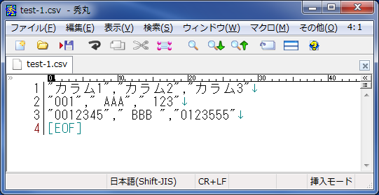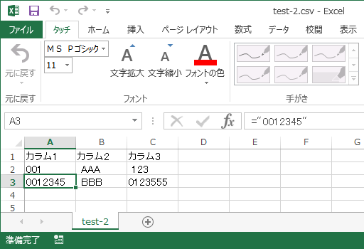 そこで先頭ゼロのカラムデータは値をダブルコーテーションで囲んで先頭に = (イコール)を 置いてやります。 以下の様にCSVファイルを変更してやります。