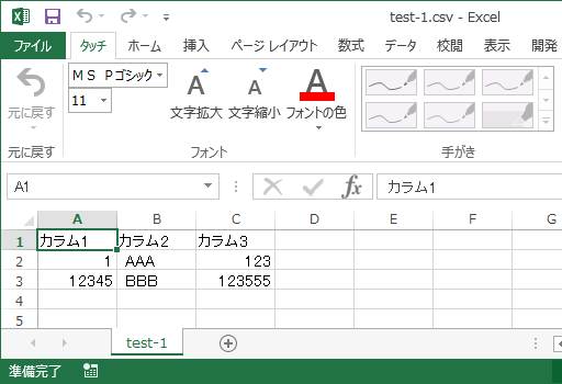 以下の様なCSVファイルをエクセルに読込んでみます。