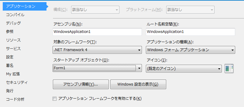 「アプリケーションフレームワークを有効にする」のチェックを外し無効にします。
