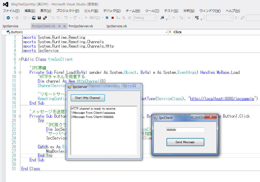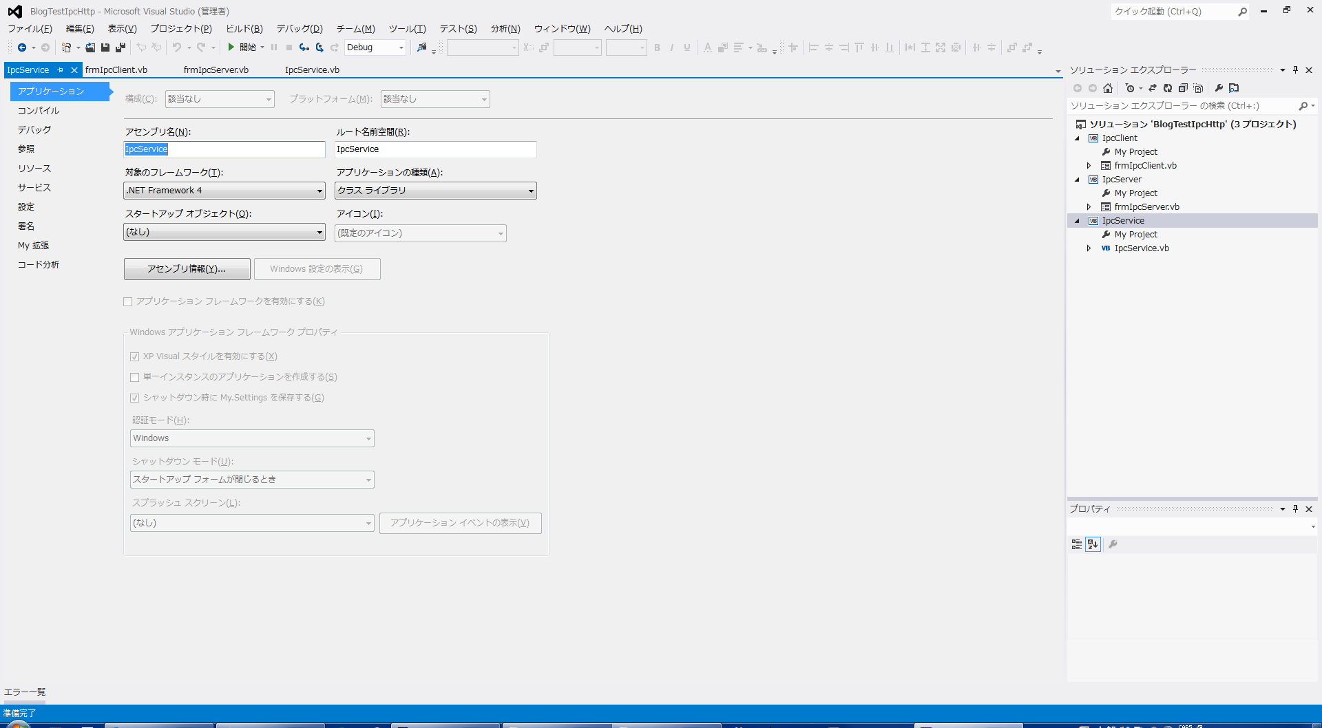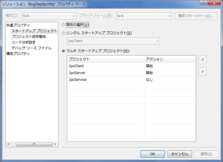 Imports System.Runtime.Remoting Imports System.Runtime.Remoting.Channels Imports System.Runtime.Remoting.Channels.Http Imports IpcService Public Class frmIpcClient 'IPC準備 Private Sub Form1_Load(ByVal sender As System.Object, ByVal e As System.EventArgs) Handles MyBase.Load 'HTTPチャネルを用意する Dim channel As New HttpChannel(0) ChannelServices.RegisterChannel(channel, False) 'リモートサーバへの接続準備 RemotingConfiguration.RegisterWellKnownClientType(GetType(ServiceClass), "http://localhost:8080/ipcsample") End Sub 'メッセージを送信する Private Sub Button1_Click(ByVal sender As System.Object, ByVal e As System.EventArgs) Handles Button1.Click Try 'IPC用クラスの生成 Dim IpcServiceClass As ServiceClass = New ServiceClass() 'サーバへの通知(引数には、送信したいメッセージを指定) IpcServiceClass.RaiseServerEvent("Message From Client=>" & Me.TextBox1.Text) Catch ex As Exception MsgBox(ex.Message) End Try End Sub End Classこのソリューションをデバッグ実行するために、ソリューションのプロパティを以下の図の様に設定します。
