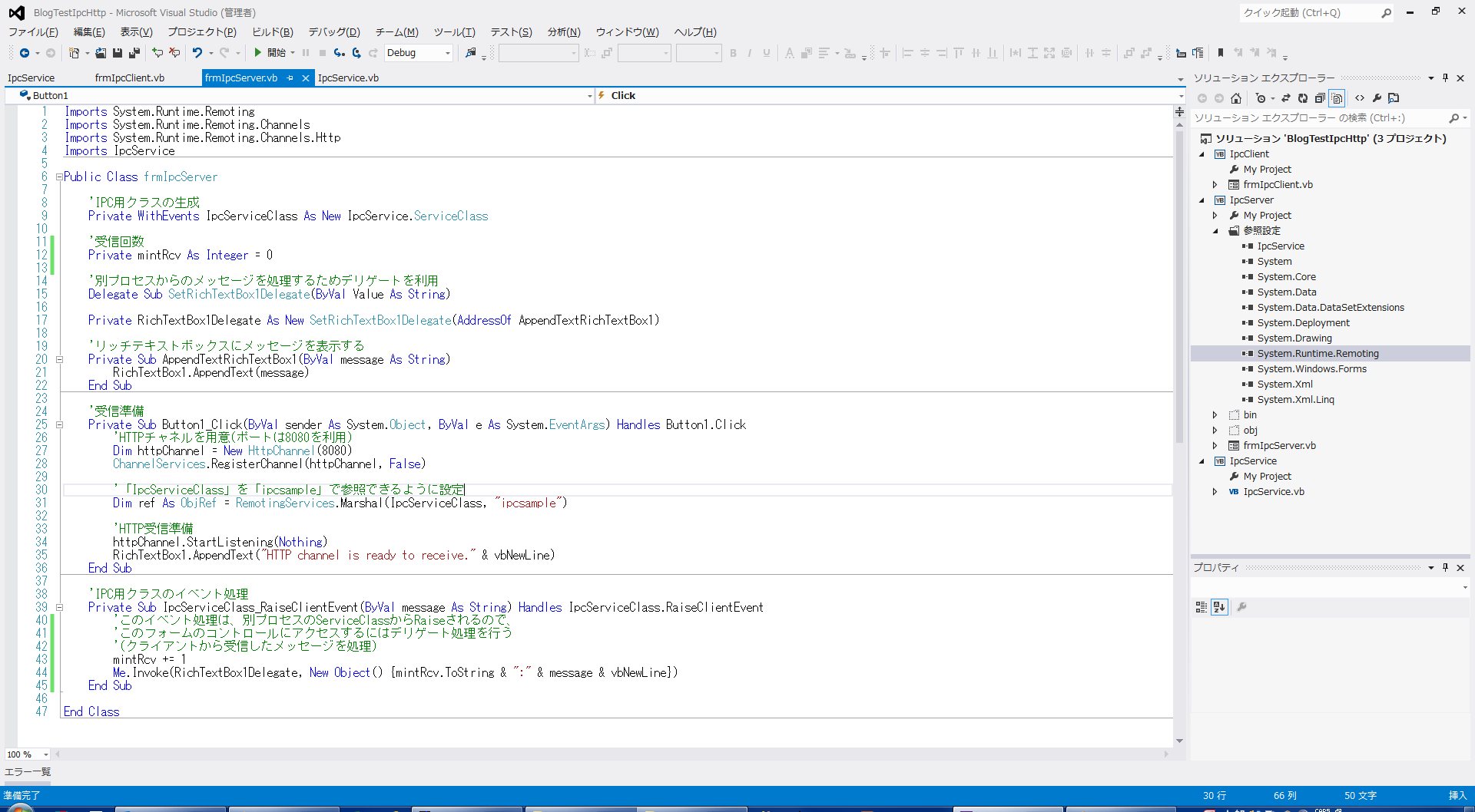 Imports System.Runtime.Remoting Imports System.Runtime.Remoting.Channels Imports System.Runtime.Remoting.Channels.Http Imports IpcService Public Class frmIpcServer 'IPC用クラスの生成 Private WithEvents IpcServiceClass As New IpcService.ServiceClass '受信回数 Private mintRcv As Integer = 0 '別プロセスからのメッセージを処理するためデリゲートを利用 Delegate Sub SetRichTextBox1Delegate(ByVal Value As String) Private RichTextBox1Delegate As New SetRichTextBox1Delegate(AddressOf AppendTextRichTextBox1) 'リッチテキストボックスにメッセージを表示する Private Sub AppendTextRichTextBox1(ByVal message As String) RichTextBox1.AppendText(message) End Sub '受信準備 Private Sub Button1_Click(ByVal sender As System.Object, ByVal e As System.EventArgs) Handles Button1.Click 'HTTPチャネルを用意(ポートは8080を利用) Dim httpChannel = New HttpChannel(8080) ChannelServices.RegisterChannel(httpChannel, False) '「IpcServiceClass」を「ipcsample」で参照できるように設定 Dim ref As ObjRef = RemotingServices.Marshal(IpcServiceClass, "ipcsample") 'HTTP受信準備 httpChannel.StartListening(Nothing) RichTextBox1.AppendText("HTTP channel is ready to receive." & vbNewLine) End Sub 'IPC用クラスのイベント処理 Private Sub IpcServiceClass_RaiseClientEvent(ByVal message As String) Handles IpcServiceClass.RaiseClientEvent 'このイベント処理は、別プロセスのServiceClassからRaiseされるので、 'このフォームのコントロールにアクセスするにはデリゲート処理を行う '(クライアントから受信したメッセージを処理) mintRcv += 1 Me.Invoke(RichTextBox1Delegate, New Object() {mintRcv.ToString & ":" & message & vbNewLine}) End Sub End Class尚、このプロジェクトの参照設定で以下のものを追加します。