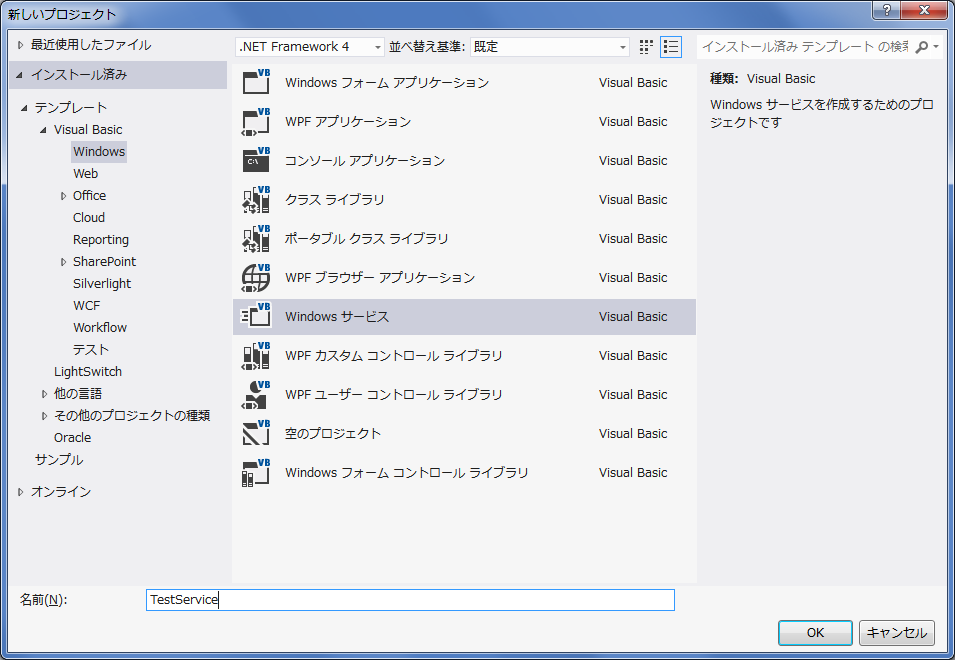 「名前」が「WindowsServices1」となっているのを、仮に「TestService」に変更し、「OK」ボタンを押下します。