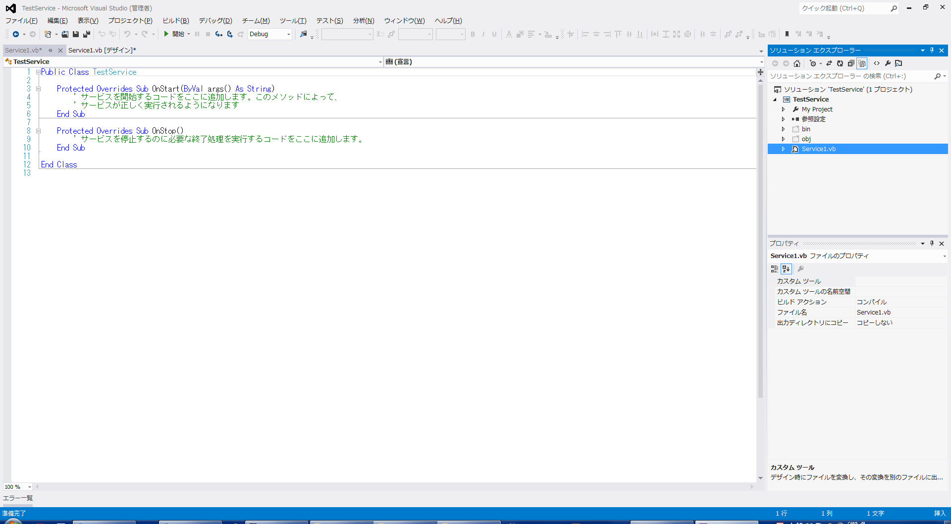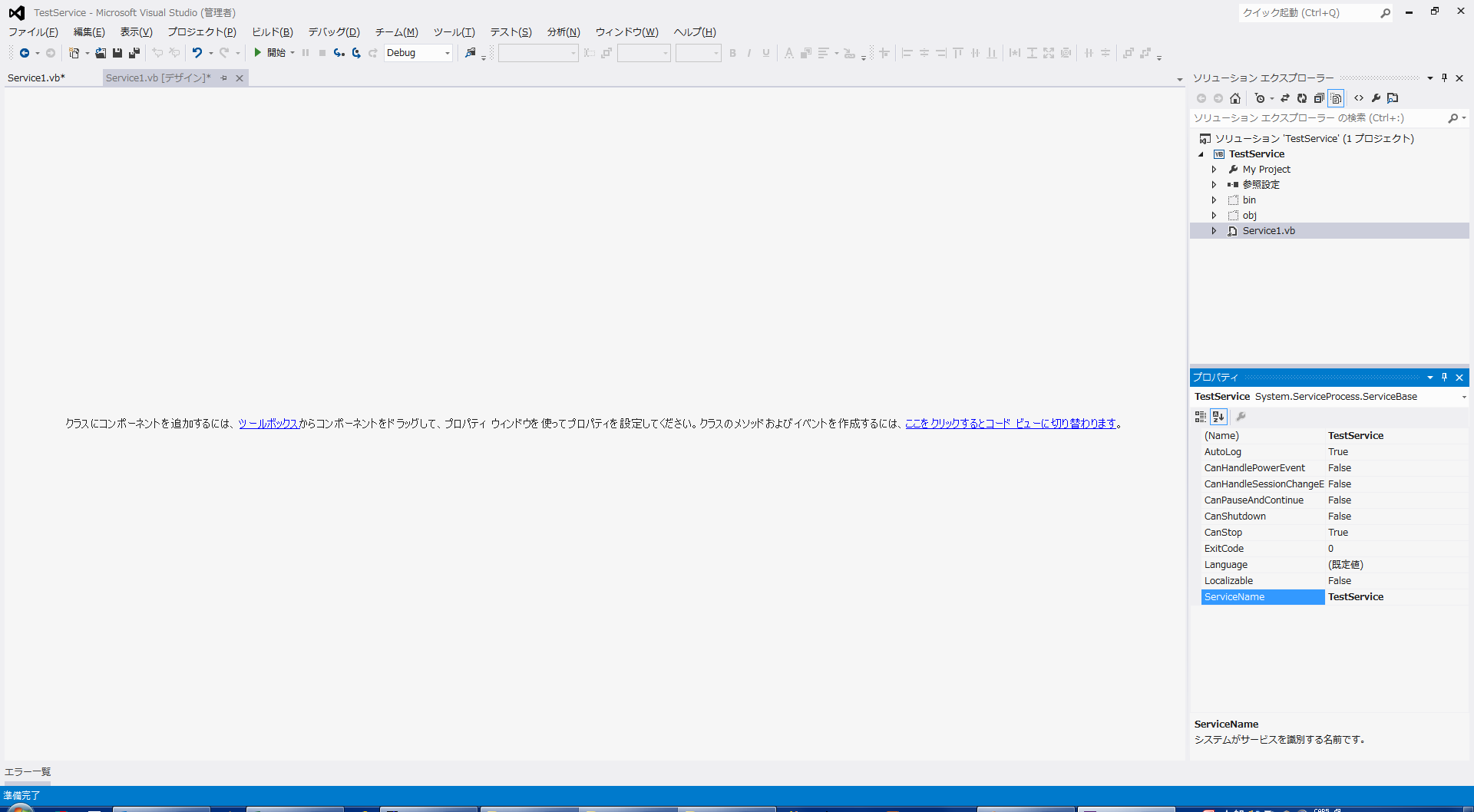 尚、画面はプロジェクト名を「TestService」と変更し、更に「TestService.vb[デザイン]」のプロパティで、「ServiceName」も「TestService」に全て変更しました。