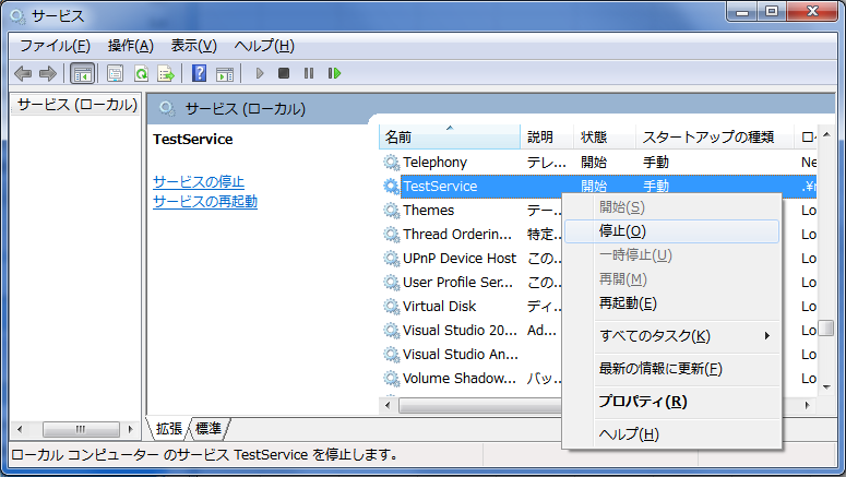 これでサービスに登録が終わりましたので、「コントロールパネル」⇒「管理ツール」⇒「サービス」を起動します。 サービスの一覧の中に「TestService」があると思いますので、サービスの「開始」を行います。以下の様に、サービスの状態が「開始」になります。