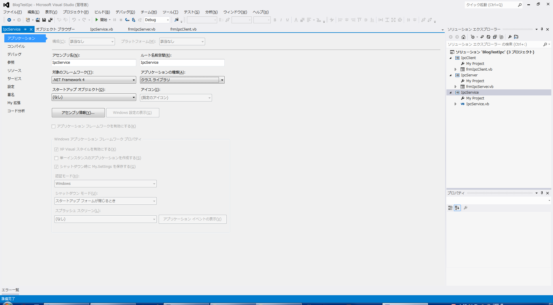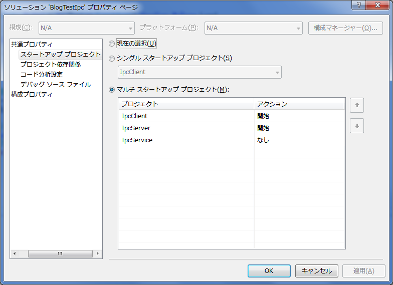 Imports System.Runtime.Remoting Imports System.Runtime.Remoting.Channels Imports System.Runtime.Remoting.Channels.Ipc Imports IpcService Public Class frmIpcClient 'IPC準備 Private Sub Form1_Load(ByVal sender As System.Object, ByVal e As System.EventArgs) Handles MyBase.Load 'IPCチャネルを用意する Dim ipcChannel As New IpcClientChannel ChannelServices.RegisterChannel(ipcChannel, False) End Sub 'メッセージを送信する Private Sub Button1_Click(ByVal sender As System.Object, ByVal e As System.EventArgs) Handles Button1.Click Try '既存のリモートIPCオブジェクトへの参照を取得する Dim strURL As String = "ipc://ipcPort/" + GetType(ServiceClass).Name Dim objRemote As Object = Activator.GetObject(GetType(ServiceClass), strURL) 'サーバとの共通クラスの参照(ServiceClass) Dim objServiceClass As ServiceClass = CType(objRemote, ServiceClass) '共有参照クラスのイベント生成メソッド呼び出し objServiceClass.RaiseServerEvent("Message From Client=>" & Me.TextBox1.Text) Catch ex As Exception MsgBox(ex.Message) End Try End Sub End Classこのソリューションをデバッグ実行するために、ソリューションのプロパティを以下の図の様に設定します。
