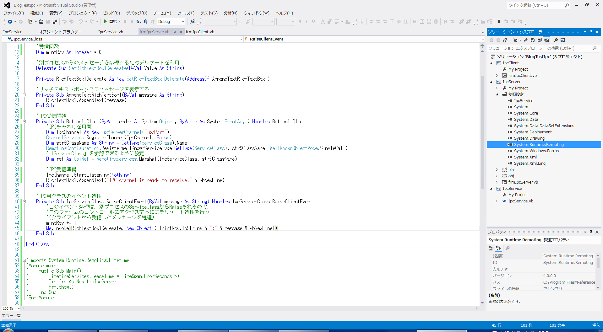 Imports System.Runtime.Remoting Imports System.Runtime.Remoting.Channels Imports System.Runtime.Remoting.Channels.Http Imports IpcService Public Class frmIpcServer 'IPC用クラスの生成 Private WithEvents IpcServiceClass As New IpcService.ServiceClass '受信回数 Private mintRcv As Integer = 0 '別プロセスからのメッセージを処理するためデリゲートを利用 Delegate Sub SetRichTextBox1Delegate(ByVal Value As String) Private RichTextBox1Delegate As New SetRichTextBox1Delegate(AddressOf AppendTextRichTextBox1) 'リッチテキストボックスにメッセージを表示する Private Sub AppendTextRichTextBox1(ByVal message As String) RichTextBox1.AppendText(message) End Sub '受信準備 Private Sub Button1_Click(ByVal sender As System.Object, ByVal e As System.EventArgs) Handles Button1.Click 'HTTPチャネルを用意(ポートは8080を利用) Dim httpChannel = New HttpChannel(8080) ChannelServices.RegisterChannel(httpChannel, False) '「IpcServiceClass」を「ipcsample」で参照できるように設定 Dim ref As ObjRef = RemotingServices.Marshal(IpcServiceClass, "ipcsample") 'HTTP受信準備 httpChannel.StartListening(Nothing) RichTextBox1.AppendText("HTTP channel is ready to receive." & vbNewLine) End Sub 'IPC用クラスのイベント処理 Private Sub IpcServiceClass_RaiseClientEvent(ByVal message As String) Handles IpcServiceClass.RaiseClientEvent 'このイベント処理は、別プロセスのServiceClassからRaiseされるので、 'このフォームのコントロールにアクセスするにはデリゲート処理を行う '(クライアントから受信したメッセージを処理) mintRcv += 1 Me.Invoke(RichTextBox1Delegate, New Object() {mintRcv.ToString & ":" & message & vbNewLine}) End Sub End Class尚、このプロジェクトの参照設定で以下のものを追加します。