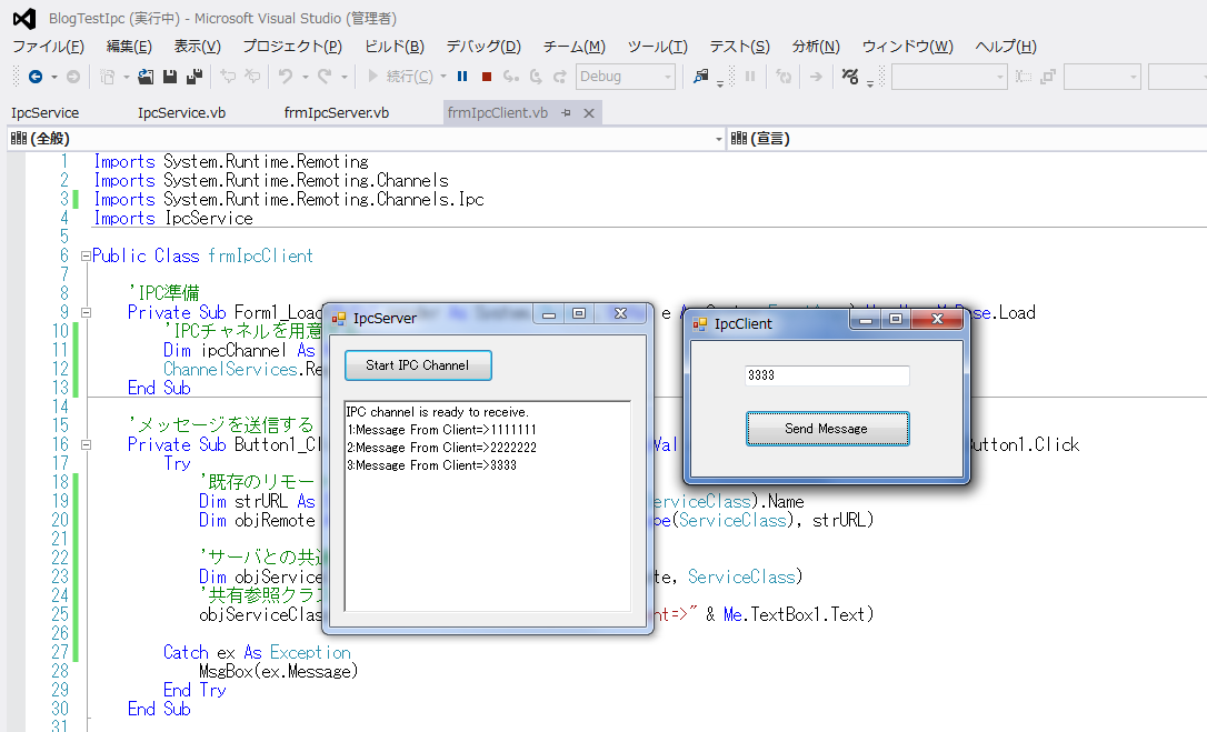 Imports System.Runtime.Remoting Imports System.Runtime.Remoting.Channels Imports System.Runtime.Remoting.Channels.Ipc Imports IpcService Public Class frmIpcServer 'IPC用クラスの生成 Private WithEvents IpcServiceClass As New IpcService.ServiceClass '受信回数 Private mintRcv As Integer = 0 '別プロセスからのメッセージを処理するためデリゲートを利用 Delegate Sub SetRichTextBox1Delegate(ByVal Value As String) Private RichTextBox1Delegate As New SetRichTextBox1Delegate(AddressOf AppendTextRichTextBox1) 'リッチテキストボックスにメッセージを表示する Private Sub AppendTextRichTextBox1(ByVal message As String) RichTextBox1.AppendText(message) End Sub 'IPC受信開始 Private Sub Button1_Click(ByVal sender As System.Object, ByVal e As System.EventArgs) Handles Button1.Click 'IPCチャネルを用意 Dim IpcChannel As New IpcServerChannel("ipcPort") ChannelServices.RegisterChannel(IpcChannel, False) Dim strSClassName As String = GetType(ServiceClass).Name RemotingConfiguration.RegisterWellKnownServiceType(GetType(ServiceClass), strSClassName, WellKnownObjectMode.SingleCall) '「ServiceClass」を参照できるように設定 Dim ref As ObjRef = RemotingServices.Marshal(IpcServiceClass, strSClassName) 'IPC受信準備 IpcChannel.StartListening(Nothing) RichTextBox1.AppendText("IPC channel is ready to receive." & vbNewLine) End Sub 'IPC用クラスのイベント処理 Private Sub IpcServiceClass_RaiseClientEvent(ByVal message As String) Handles IpcServiceClass.RaiseClientEvent 'このイベント処理は、別プロセスのServiceClassからRaiseされるので、 'このフォームのコントロールにアクセスするにはデリゲート処理を行う '(クライアントから受信したメッセージを処理) mintRcv += 1 Me.Invoke(RichTextBox1Delegate, New Object() {mintRcv.ToString & ":" & message & vbNewLine}) End Sub End Class尚、このプロジェクトの参照設定で以下のものを追加します。