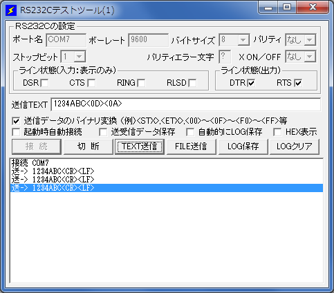 インストール後の「RS232Cテストツール」を動作させている様子を以下に示します。