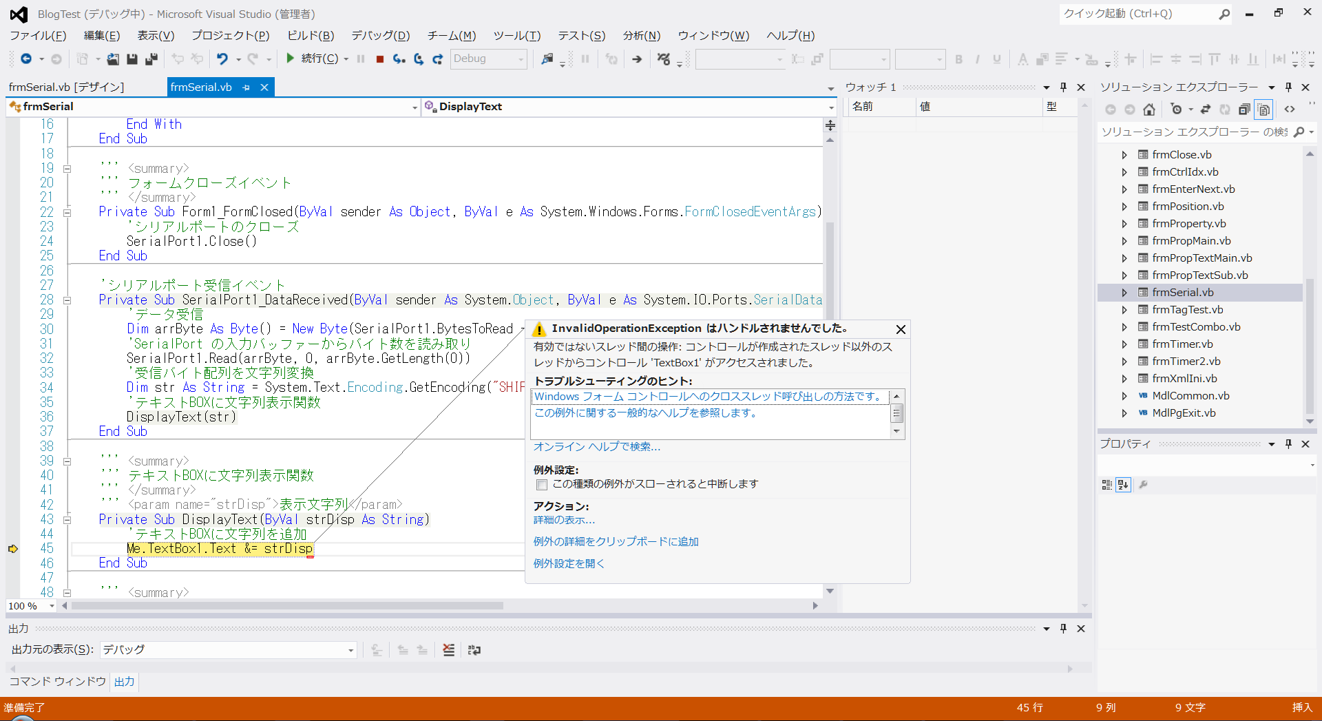 Public Class frmSerial '''''' フォームロードイベント ''' Private Sub Form1_Load(ByVal sender As System.Object, ByVal e As System.EventArgs) Handles MyBase.Load With SerialPort1 'シリアルポートの設定 .PortName = "COM8" 'ポート名 .BaudRate = 9600 '通信速度指定 .Parity = IO.Ports.Parity.None 'パリティ指定 .DataBits = 8 'ビット数指定 .StopBits = IO.Ports.StopBits.One 'ストップビット指定 'シリアルポートのオープン .Open() End With End Sub '''''' フォームクローズイベント ''' Private Sub Form1_FormClosed(ByVal sender As Object, ByVal e As System.Windows.Forms.FormClosedEventArgs) Handles Me.FormClosed 'シリアルポートのクローズ SerialPort1.Close() End Sub '''''' シリアルポート受信イベント ''' Private Sub SerialPort1_DataReceived(ByVal sender As System.Object, ByVal e As System.IO.Ports.SerialDataReceivedEventArgs) Handles SerialPort1.DataReceived 'データ受信 Dim arrByte As Byte() = New Byte(SerialPort1.BytesToRead - 1) {} '受信バッファー内のデータのバイト数分 'SerialPort の入力バッファーからバイト数を読み取り SerialPort1.Read(arrByte, 0, arrByte.GetLength(0)) '受信バイト配列を文字列変換 Dim str As String = System.Text.Encoding.GetEncoding("SHIFT-JIS").GetString(arrByte) 'テキストBOXに文字列表示関数 DisplayText(str) End Sub '''''' テキストBOXに文字列表示関数 ''' ''' <param name="strDisp">表示文字列</param> Private Sub DisplayText(ByVal strDisp As String) 'テキストBOXに文字列を追加 Me.TextBox1.Text &= strDisp End Sub '''''' [Clear]ボタン処理 ''' Private Sub btnClear_Click(ByVal sender As Object, ByVal e As EventArgs) Handles btnClear.Click Me.TextBox1.Text = "" End Sub End Classこのプログラムをデバッグモードで実行させて待機状態にして置き、 先ほどの「RS232Cテストツール」を実行し、送信TEXTにデータを設定し、送信します。 送信ボタン押下した時に、今回のプログラムのTextBoxにデータが表示されるはずですが 実際は以下の様なエラーが発生しました。
