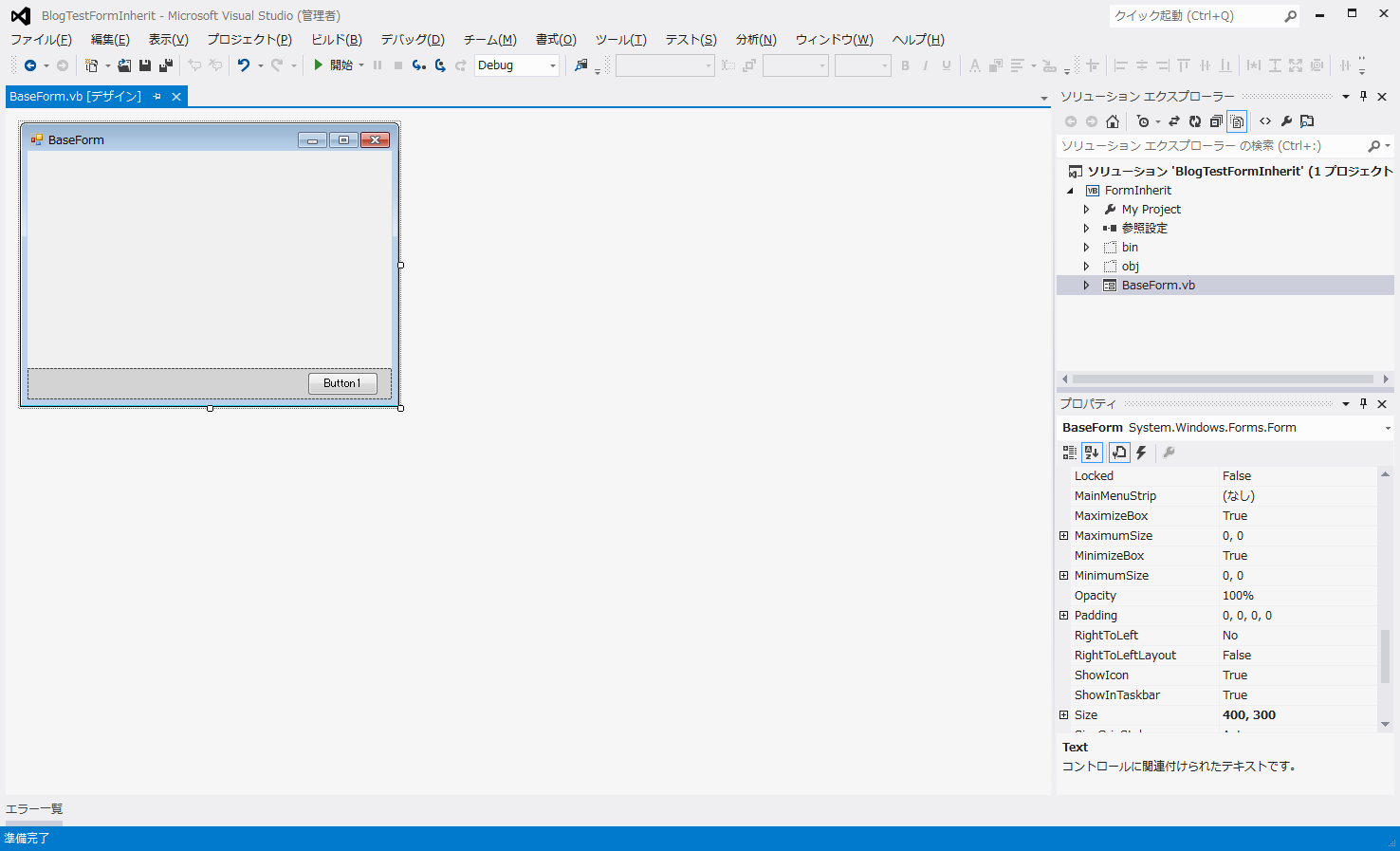 さらに、ボタン処理を継承先から上書き変更できる様にしたいと思います。 BaseForm 側では Button1_Click メソッドに Overridable 修飾子を付加して上書き可能であることを宣言します。