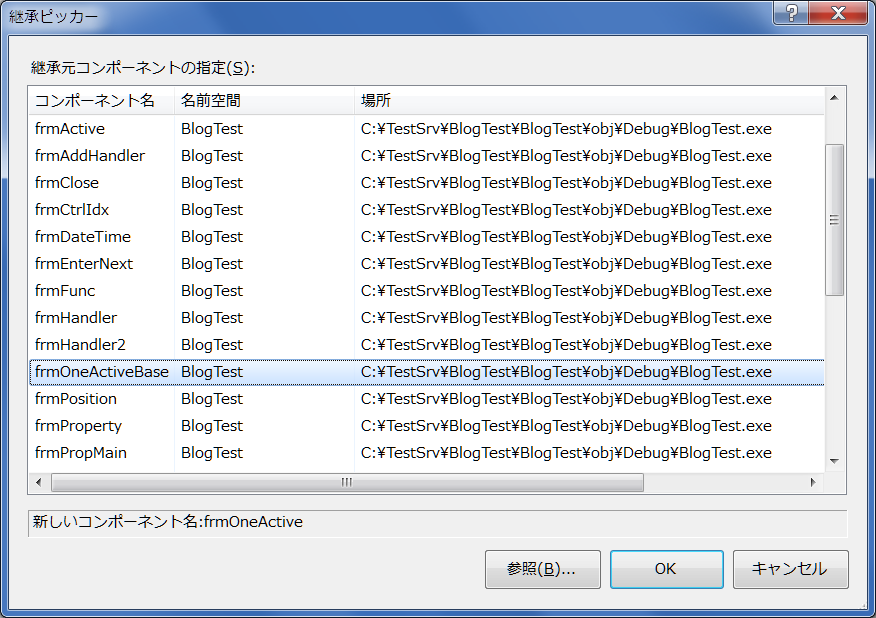 その後「継承ピッカー」の選択になりますので、先ほどの「frmOneActiveBase」を選択しますと以下の様な表示なります。