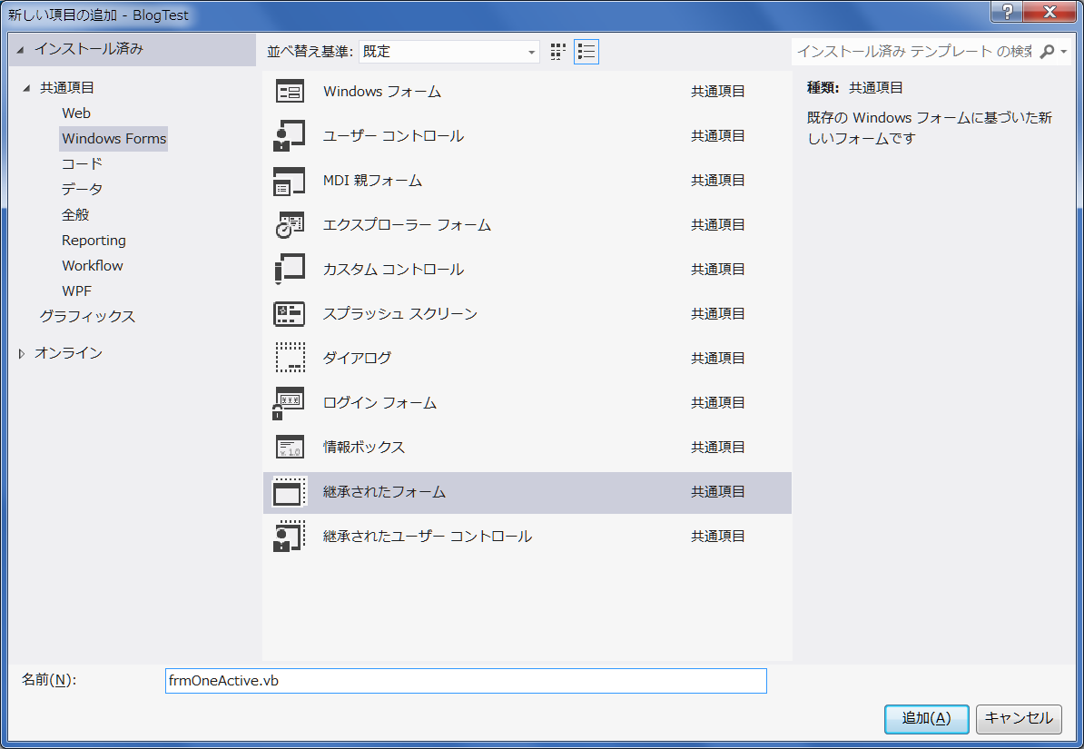 メインメニューの「プロジェクト」⇒「新しい項目の追加」を選択し、以下の表示になったら 左の「Windows Fomrs」を選択後「継承されたフォーム」を選択し、フォーム名をfrmOneActiveとします。