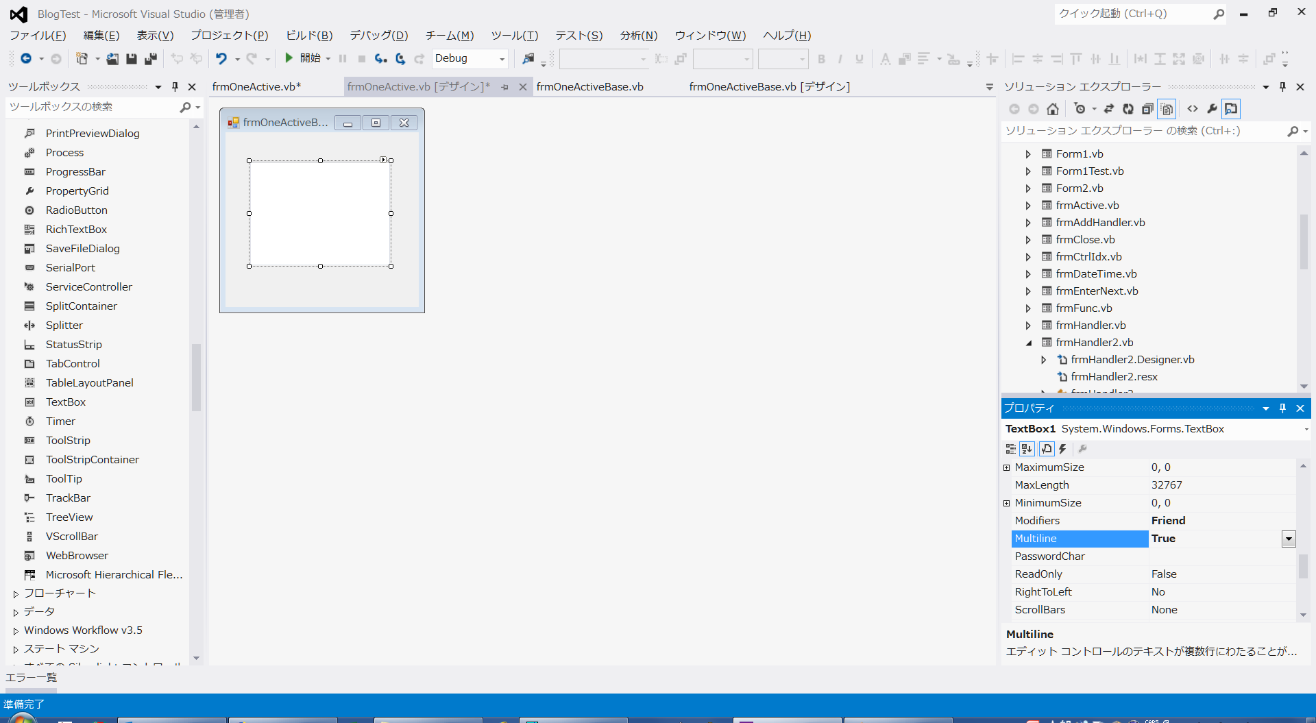 frmOneActiveのフォームが表示されたら、1個のテキストボックスを貼付け、 複数行許可を画面右のプロパティウインドウから行います。