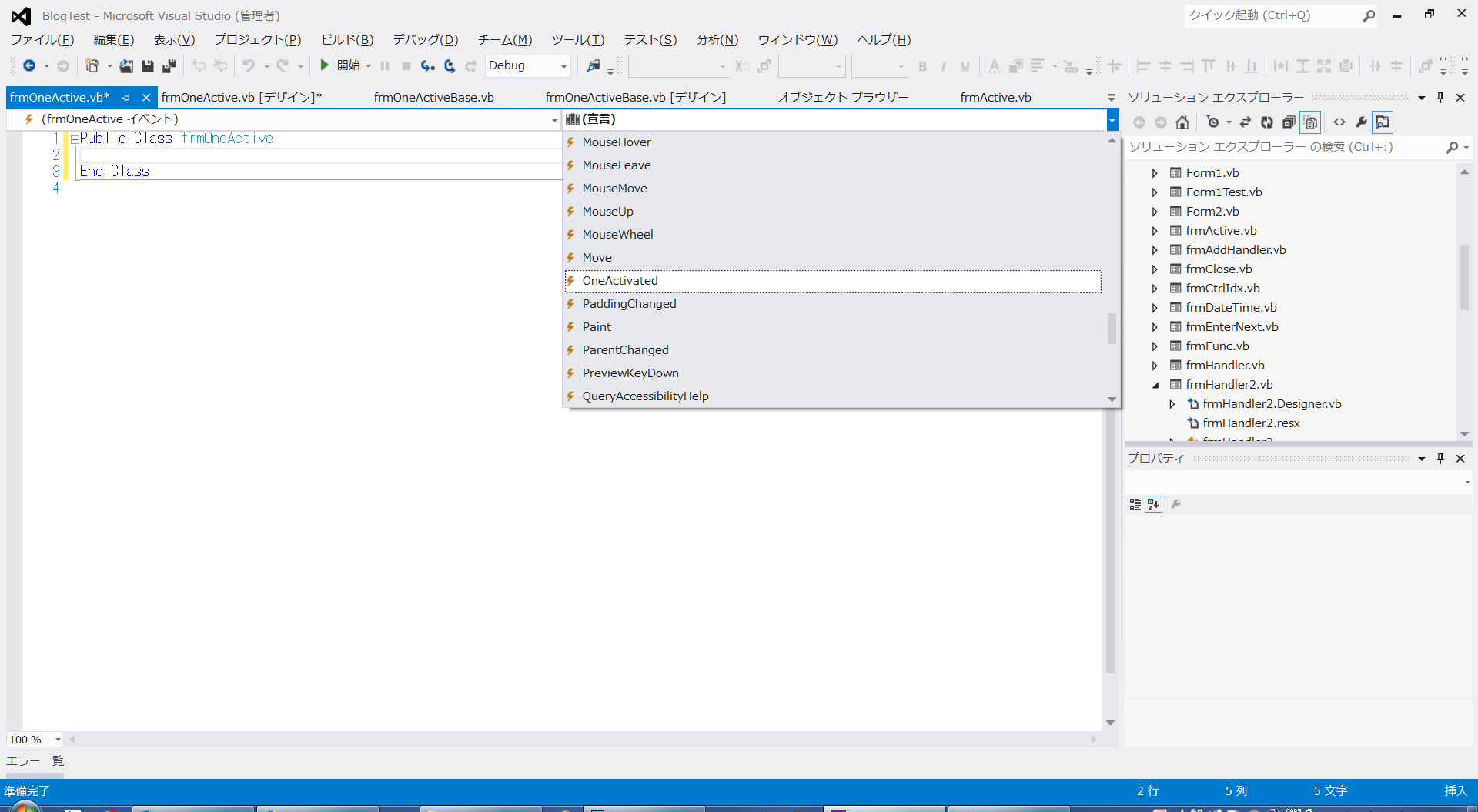 Public Class frmOneActiveBase 'イベント宣言 Public Event OneActivated(ByVal sender As Object, ByVal e As EventArgs) 'アクティブフラグ Private mblnActivated As Boolean = False '''''' フォームアクティブイベント ''' Private Sub frmOneActiveBase_Activated(sender As Object, e As EventArgs) Handles Me.Activated 'アクティブフラグOFF?? If Me.mblnActivated = False Then 'フラグON Me.mblnActivated = True 'イベント発生 RaiseEvent OneActivated(Me, New EventArgs) End If End Sub '''''' フォームロードイベント ''' Private Sub frmOneActiveBase_Load(sender As Object, e As EventArgs) Handles Me.Load Me.mblnActivated = False End Sub End Classここで一旦ビルド作業を行います。 その後、このfrmOneActiveBaseフォームを継承するフォームを作成してみます。