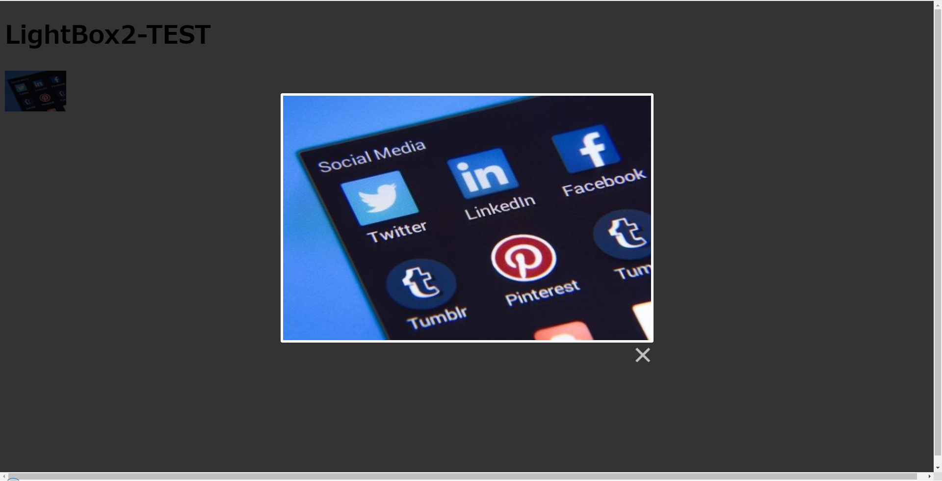 <!DOCTYPE html> <head> <link href="./js/lightbox2-2.11.4/css/lightbox.min.css" rel="stylesheet"> <script type="text/javascript" src="./js/jquery-3.6.0/jquery-3.6.0.min.js"></script> <script src="./js/lightbox2-2.11.4/js/lightbox-plus-jquery.min.js"></script> <script> // lightbox start $(function() { lightbox.option({ "positionFromTop": 150, }); }); </script> </head> <body> <h1>LightBox2-TEST</h1> <a href="./test-1.jpg" data-lightbox="album" > <img src="./test-1.jpg" id="" width="100" > </a> </body> </html>