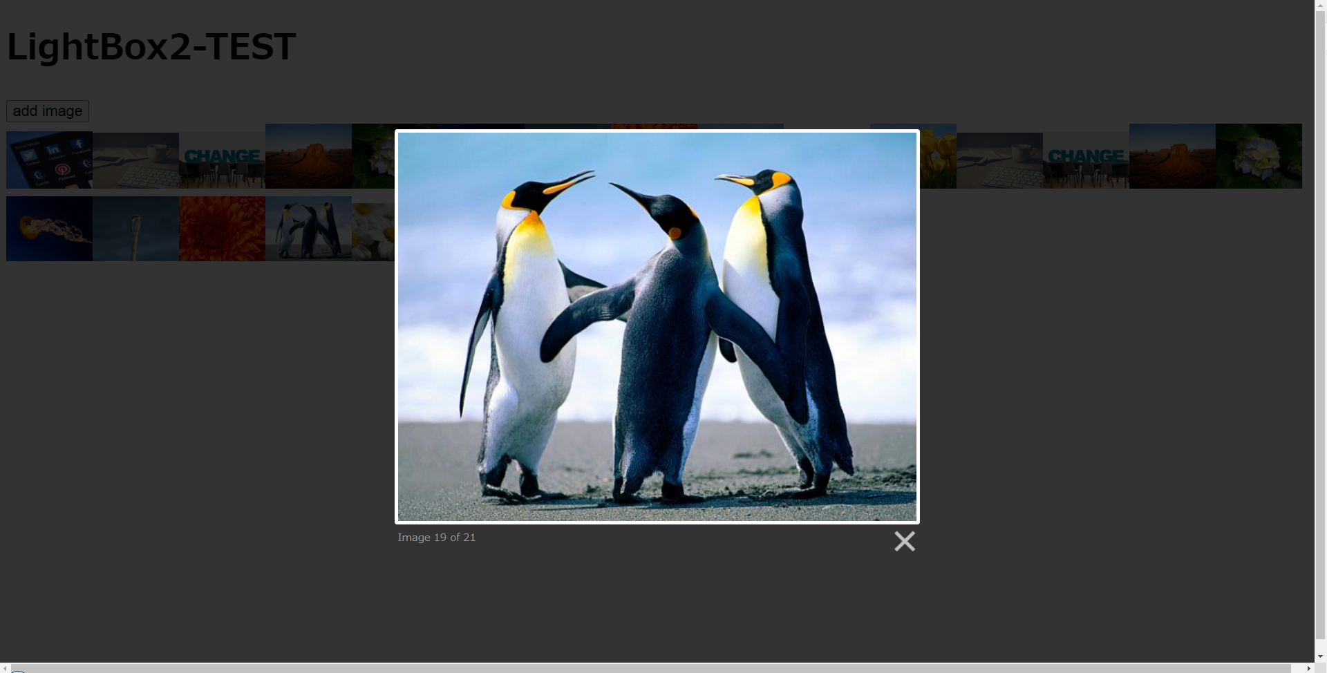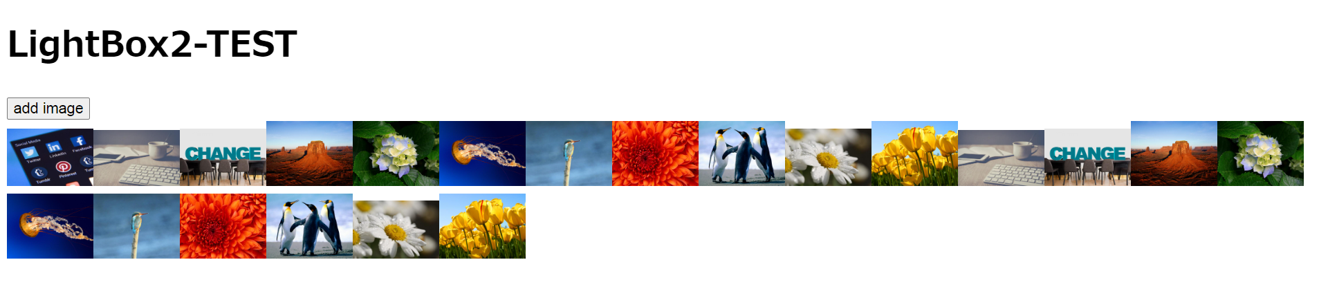 <!DOCTYPE html> <head> <link href="./js/lightbox2-2.11.4/css/lightbox.min.css" rel="stylesheet"> <script type="text/javascript" src="./js/jquery-3.6.0/jquery-3.6.0.min.js"></script> <script src="./js/lightbox2-2.11.4/js/lightbox-plus-jquery.min.js"></script> <script> // lightbox start $(function() { lightbox.option({ "positionFromTop": 150, }); }); $(function() { $("#btn").on('click', function() { for (i = 1; i <= 10; i++) { var add = ""; add += '<a href="./add-'+i+'.jpg" data-lightbox="album" >'; add += '<img src="./add-'+i+'.jpg" width="100" >'; add += '</a>'; $("#imgdiv").append(add); } }); }); </script> </head> <body> <h1>LightBox2-TEST</h1> <button id="btn">add image</button> <div id="imgdiv"><a href="./test-1.jpg" data-lightbox="album"><img src="./test-1.jpg" width="100"></a></div> </body> </html>「add image」をクリックする前の表示は以下の通りです。