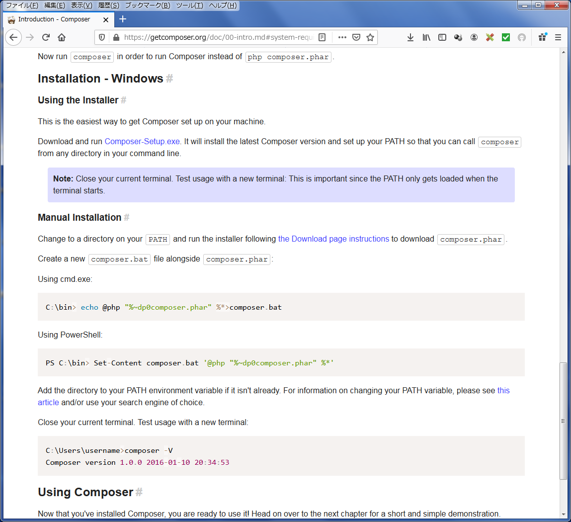 composerのサイト(Windows)