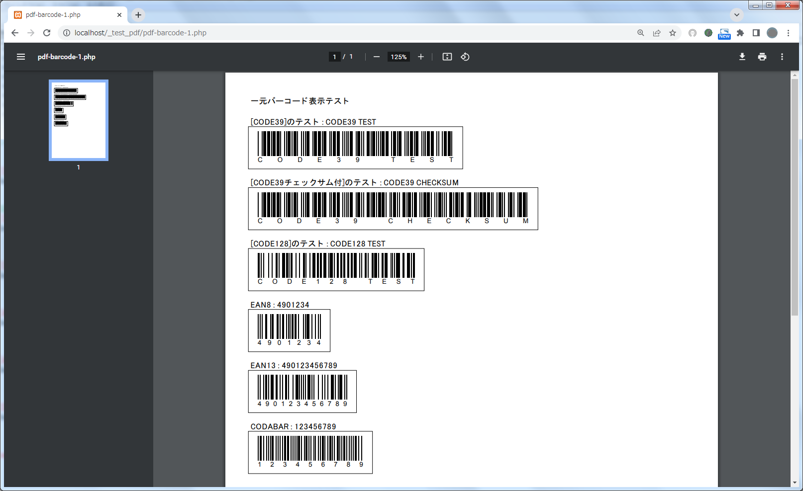 <?php require_once('../tcpdf/tcpdf.php'); // クラス生成 $pdf = new TCPDF(); // デフォルトで用意されている日本語フォント[小塚ゴシックPro M] $strFont = "kozgopromedium"; // ヘッダ・フッタ出力設定(特にいらないが) $pdf->setPrintHeader(false); $pdf->setPrintFooter(false); // 本文の日本語フォント[小塚ゴシックPro M] $pdf->SetFont($strFont, "", 10); // 新しいpdfページを追加 $pdf->AddPage(); $pdf->Write(0, '一元バーコード表示テスト', '', false, '', true); $pdf->Ln(); // define barcode style $style = array( 'border' => true, //枠線有 'hpadding' => 'auto', //水平空白埋め自動 'vpadding' => 'auto', //垂直空白埋め自動 'fgcolor' => array(0,0,0), //テキスト色黒 'bgcolor' => false, //背景色指定無し 'text' => true, //テキスト表示 'font' => 'helvetica', // 'fontsize' => 8, // 'stretchtext' => 4 , // 'position' => '', //位置は現在位置 'align' => 'C', //中央揃え 'stretch' => false, //ストレッチ無し 'fitwidth' => true, //横幅にフィット 'cellfitalign' => '', //バーコードセルの位置指定無し ); // 各種の代表的なバーコード出力 // CODE 39 $pdf->Cell(0, 0, '[CODE39]のテスト : CODE39 TEST', 0, 1); $pdf->write1DBarcode('CODE39 TEST', 'C39', '', '', '', 18, 0.4, $style, 'N'); $pdf->Ln(); // CODE 39 + CHECKSUM $pdf->Cell(0, 0, '[CODE39チェックサム付]のテスト : CODE39 CHECKSUM', 0, 1); $pdf->write1DBarcode('CODE39 CHECKSUM', 'C39+', '', '', '', 18, 0.4, $style, 'N'); $pdf->Ln(); // CODE 128 $pdf->Cell(0, 0, '[CODE128]のテスト : CODE128 TEST', 0, 1); $pdf->write1DBarcode('CODE128 TEST', 'C128', '', '', '', 18, 0.4, $style, 'N'); $pdf->Ln(); // EAN 8 $pdf->Cell(0, 0, 'EAN8 : 4901234', 0, 1); $pdf->write1DBarcode('4901234', 'EAN8', '', '', '', 18, 0.4, $style, 'N'); $pdf->Ln(); // EAN 13 $pdf->Cell(0, 0, 'EAN13 : 490123456789', 0, 1); $pdf->write1DBarcode('490123456789', 'EAN13', '', '', '', 18, 0.4, $style, 'N'); $pdf->Ln(); // CODABAR $pdf->Cell(0, 0, 'CODABAR : 123456789', 0, 1); $pdf->write1DBarcode('123456789', 'CODABAR', '', '', '', 18, 0.4, $style, 'N'); $pdf->Ln(); // pdf表示設定 $pdf->Output('pdf-barcode-1.pdf', 'I'); ?>これの実行結果は以下の通りです。