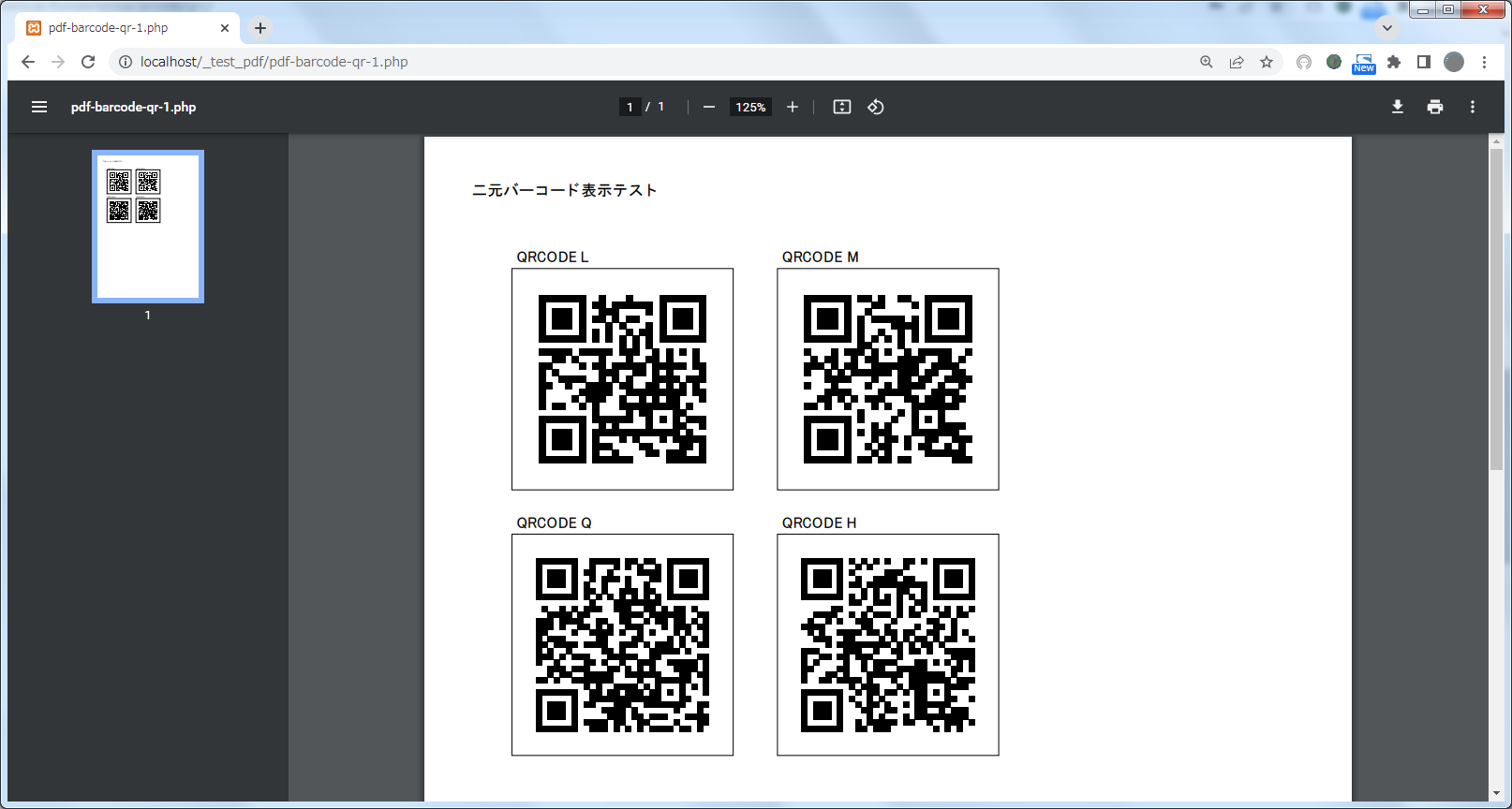 <?php require_once('../tcpdf/tcpdf.php'); // クラス生成 $pdf = new TCPDF(); // デフォルトで用意されている日本語フォント[小塚ゴシックPro M] $strFont = "kozgopromedium"; // ヘッダ・フッタ出力設定(特にいらないが) $pdf->setPrintHeader(false); $pdf->setPrintFooter(false); // 本文の日本語フォント[小塚ゴシックPro M] $pdf->SetFont($strFont, "", 10); // 新しいpdfページを追加 $pdf->AddPage(); $pdf->Write(0, '二元バーコード表示テスト', '', false, '', true); $pdf->Ln(); // set style for barcode $style = array( 'border' => true, //ボーダー有 'vpadding' => 'auto', //縦パディングAUTO 'hpadding' => 'auto', //水平パディングAUTO 'fgcolor' => array(0,0,0),//テキスト・バー色(黒) 'bgcolor' => false, //背景色指定無し 'module_width' => 1, // width of a single module in points 'module_height' => 1 // height of a single module in points ); // 出力URL $strURL = "https://www.yahoo.co.jp/"; // QRCODE,L : QR-CODE Low error correction $pdf->write2DBarcode($strURL, 'QRCODE,L', 20, 30, 50, 50, $style, 'N'); $pdf->Text(20, 25, 'QRCODE L'); // QRCODE,M : QR-CODE Medium error correction $pdf->write2DBarcode($strURL, 'QRCODE,M', 80, 30, 50, 50, $style, 'N'); $pdf->Text(80, 25, 'QRCODE M'); // QRCODE,Q : QR-CODE Better error correction $pdf->write2DBarcode($strURL, 'QRCODE,Q', 20, 90, 50, 50, $style, 'N'); $pdf->Text(20, 85, 'QRCODE Q'); // QRCODE,H : QR-CODE Best error correction $pdf->write2DBarcode($strURL, 'QRCODE,H', 80, 90, 50, 50, $style, 'N'); $pdf->Text(80, 85, 'QRCODE H'); // pdf表示設定 $pdf->Output('pdf-barcode-qr-1.pdf', 'I'); ?>これの実行結果は以下の通りです。