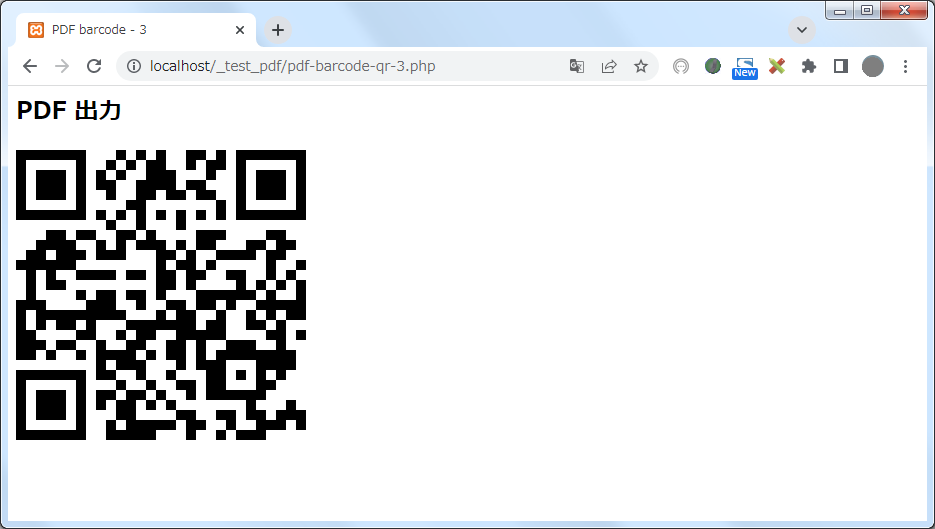 言葉で説明しても良くわかりませんので、実際の例を以下に記します。<?php //include 2D barcode class require_once('../tcpdf/tcpdf_barcodes_2d.php'); //二次元バーコードクラス生成 $str = "https://www.yahoo.co.jp/"; $barcodeobj = new TCPDF2DBarcode($str, 'QRCODE,H'); // output the barcode as HTML object $barcodehtml = $barcodeobj->getBarcodeHTML(10, 10, 'black'); ?> <html> <head> <meta charset="utf-8"> <title>PDF barcode - 3</title> </head> <body> <h2>PDF 出力</h2> <div> <?php echo($barcodehtml); ?> </div> </body> </html>特にソースは難しくはありません。これの実行した時のブラウザの結果は以下の通りです。